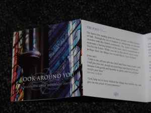 They ever only used the words of scripture which severely limited the leaflets usefulness. Roll forward a few years and they have become sgm Lifewords. The range of leaflets is less extensive than it was but they are now rather good. Above is picture of ‘Look around you’ a foldout leaflet which gives a meditative walk around a church building. So, for instance there is a simple meditation on the church door, being a symbol of God’s welcome. Then a verse from Psalm 100 – ‘Enter his gates with thanksgiving and his courts with praise; give thanks to him and praise his name. For the Lord is good and his love endures for ever.’ Then it concludes with a prayer –