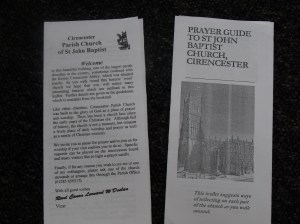 Then there are the very common freebies given out by churches. Again, very variable in quality. A few are very good indeed. Most are produced on the office photocopier and do suffer from that sometimes. I really do think that we have to make a bit of an effort when we produce materials to give out. Even on a tiny budget it is possible to produce leaflets which are, at the very least, of a presentable quality. Typically, there is a welcome note from the vicar, some historical facts to guide the visitor and some information about the life of the church. Here is a good example, along with a simple prayer leaflet, from Cirencester.