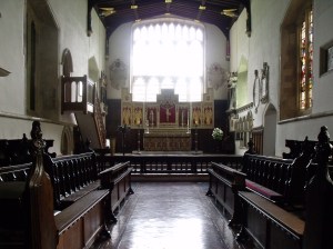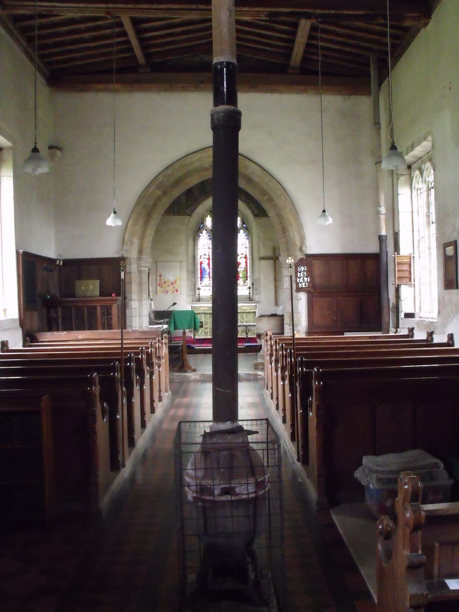 This lovely little country church is open. The signs outside are basic and there is no guide available inside that I could see. Only 1 visitor recorded in the last month! They must get more than this. There is a good display of people and events which really does help to bring the church to life. They all appeared to be having a great time! There are three things that make this church stand out. There are some good angels painted on the East wall and an interesting alabaster crucifixion scene displayed. A guide would be useful here to give some more information! Also there is the most amazing heating system – two simple flues which extend up through the roof. I am not sure how effective they would be on a cold day but someone must have a nice little job of keeping them stocked up. This is the sort of little detail that I like to notice!