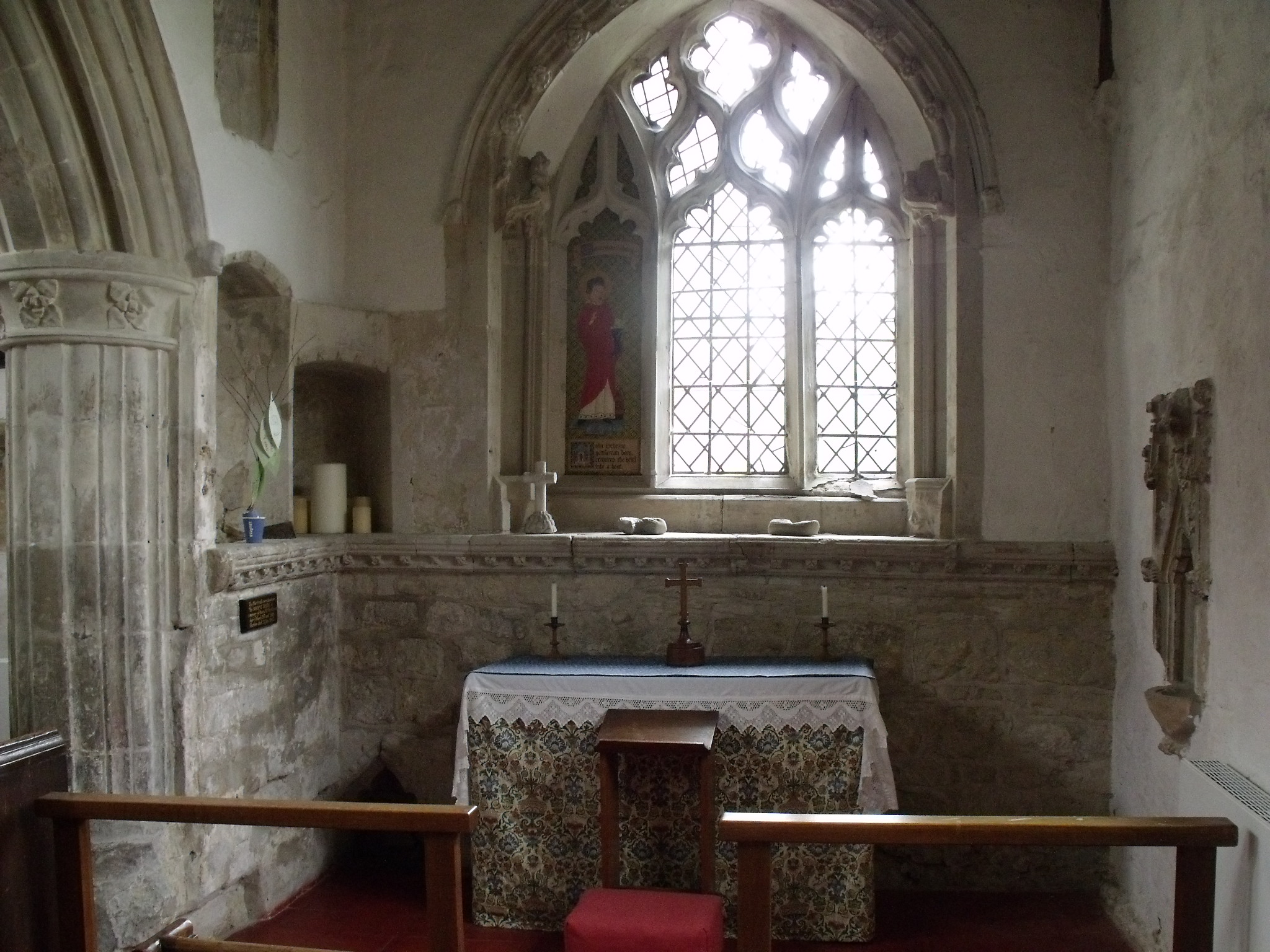 This little church exudes a sense of holiness. It used to be a pilgrimage destination as the one time Rector, Sir John Schorne, is supposed to have conjured the devil into a boot! There are quite a few ‘The Boot’ pubs around Bucks and these would have been on pilgrims routes. The remains of the shrine can be seen – picture below.