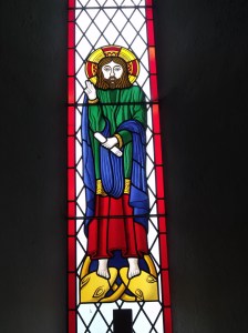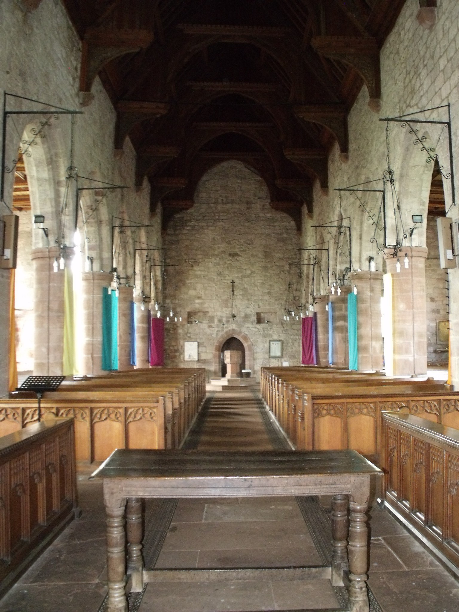 Inside there is a CD of the church registers to buy, a recipe book, t shirts (the first I have come across in a church), cloth bags, tea towels, prayer cards, post cards, guide books and a book entitled ‘Reflections on a visit to Christian Egypt’ which looked very good. Also a couple of books of poems. These are all offered to raise funds for this remote church which can’t have a very large regular congregation. Indeed, this is one case where the ‘Monday to Saturday congregation’, ie visitors must be considerably larger than the Sunday one. Some 31 people had signed the visitors book in the last month. Spiritual needs are catered for by a votive stand. There is a folder detailing the churchyard monuments and one giving details of the excellent East Window, the centre light of which features a modern rendering of St. Cuthbert.