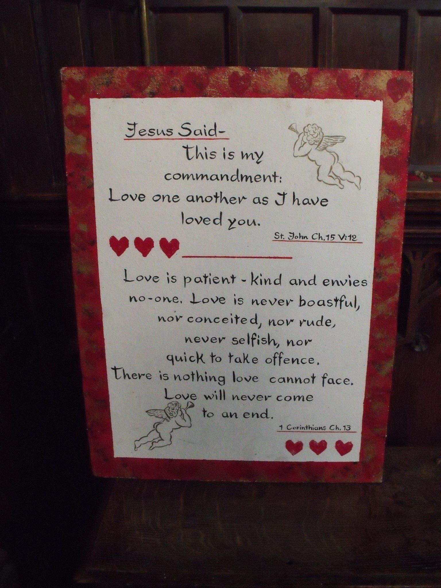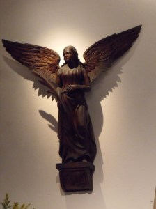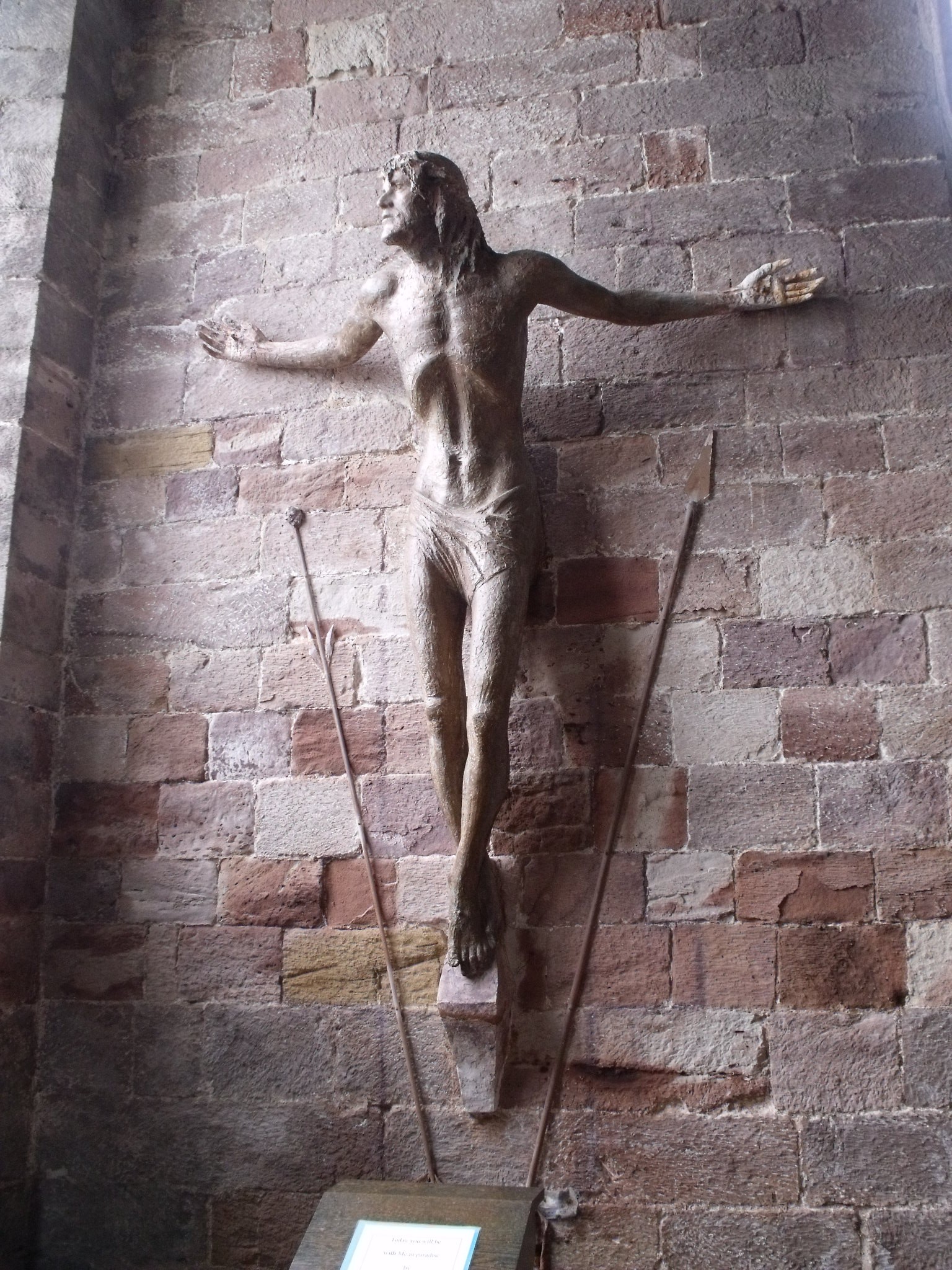 A solid and impressive church which is open to visitors. The signs outside are basic. Inside I found prayer cards, book marks (some children’s as well), a guide book and some of the Tim Tily booklets on faith as well as some sgmLife words leaflets. There is some used books for sale and these are marked up as ‘Holiday Reading’ and a suggested donation of a £1 is requested. 29 visitors in the last month. An MU display was around – I have seen quite a few of these on my travels. There is a stunning crucifix on the west wall by Josefine de Vasconcelloswhich is a moving piece of art. More of her work appears in later posts.