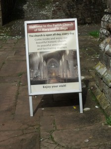 The signs outside are very good, giving a very clear welcome to visitors. It also mentions that this is a working church and that there may be a funeral or other service on – a good reminder. There is a good children’s area to use. Only 11 visitors in the book over the last month. One very noticeable thing here is the number of welcome signs.