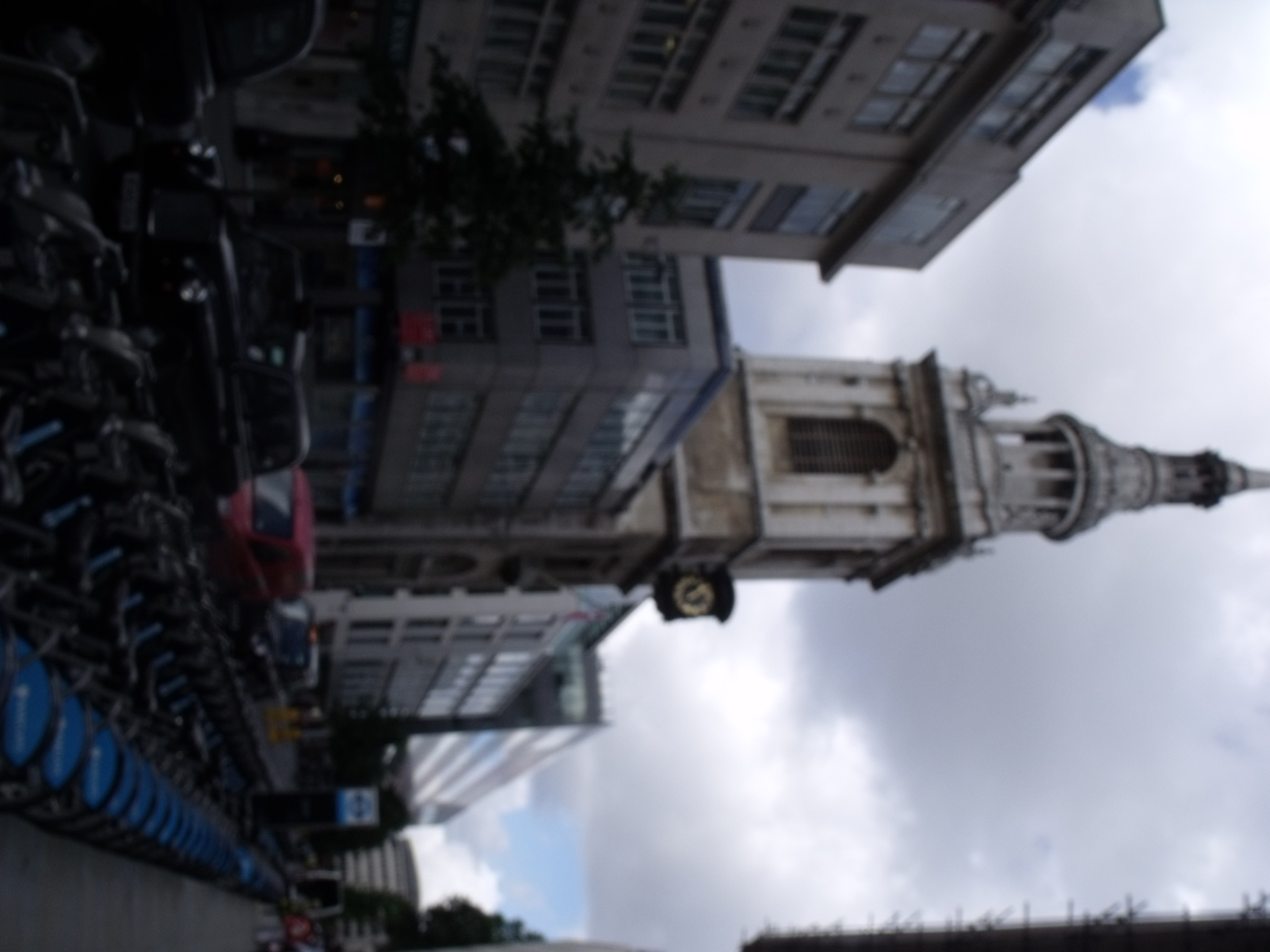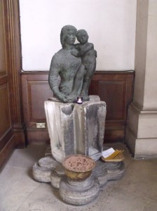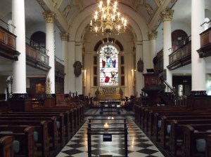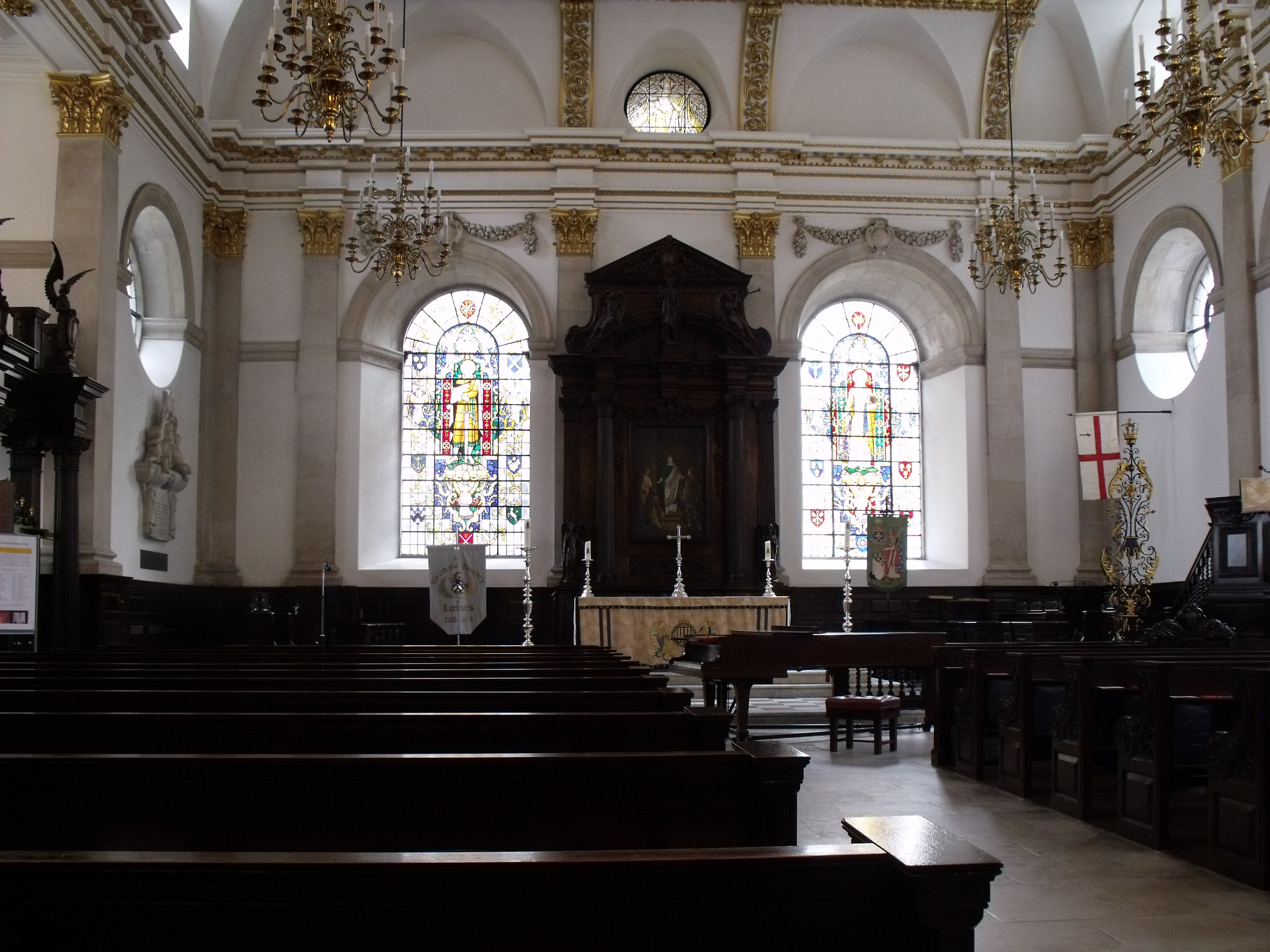 The tower of this church is an imposing presence on Cheapside. It is open every day with a cafe in the crypt. The signs make all this very clear. In the entrance hall is a modern Madonna, in front of which candles can be lit without entering the church proper. There was a display of Gospel Imprint leaflets which explain many facets of the Christian faith. There is a guide, ‘One Thousand Years of History’, in English, French, Italian and Spanish. There is also a guide to the famous bells and a larger guide book is available too. The interior is striking with modern windows being a reminder that here is another church all but destroyed in the war. It wasn’t rebuilt until 1964. There are some displays about the churches history. There is another place to light votive candles, this time a pot. The church website is http://www.stmarylebow.co.uk/ This features a short film about the church and the life of the congregation here – recommended.