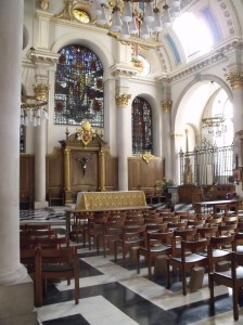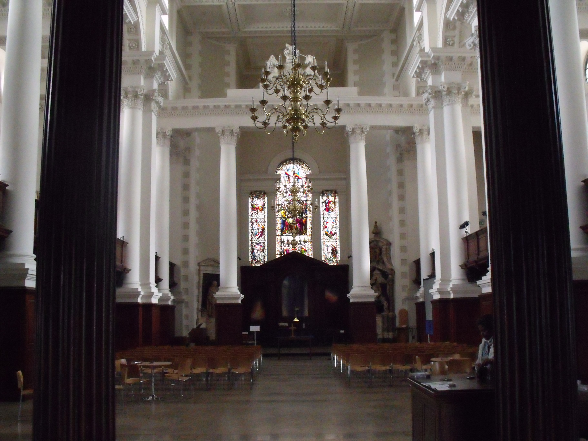 Another of my favourite London churches. St. Vedast lies in the shadow of St. Paul’s Cathedral. It suffered badly in the blitz but was fortunately rebuilt. It is open every day and the sign outside says so too. There was a friendly steward inside and another lady was cleaning the floor. This church is spotless. There was a church guide and some leaflets on The Friends of the City of London Churches’ (www.london-city-churches.org.uk ). Rather surprisingly, only 5 people had signed the visitors book in the last month – it is on a small table to the left of the main church door. This church has a wonderful interior and there is a small chapel to use for prayer as well as a votive stand. Also, there is a small courtyard to sit in next to the church. A little haven of peace in the city but the smell of cooking from the restaurant next door made me hungry! The church website can be found on http://www.vedast.org.uk/
