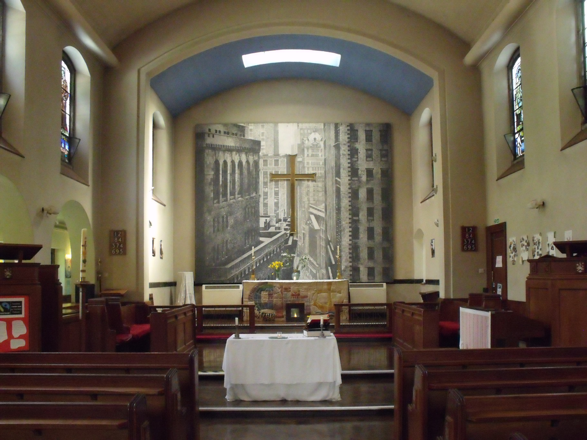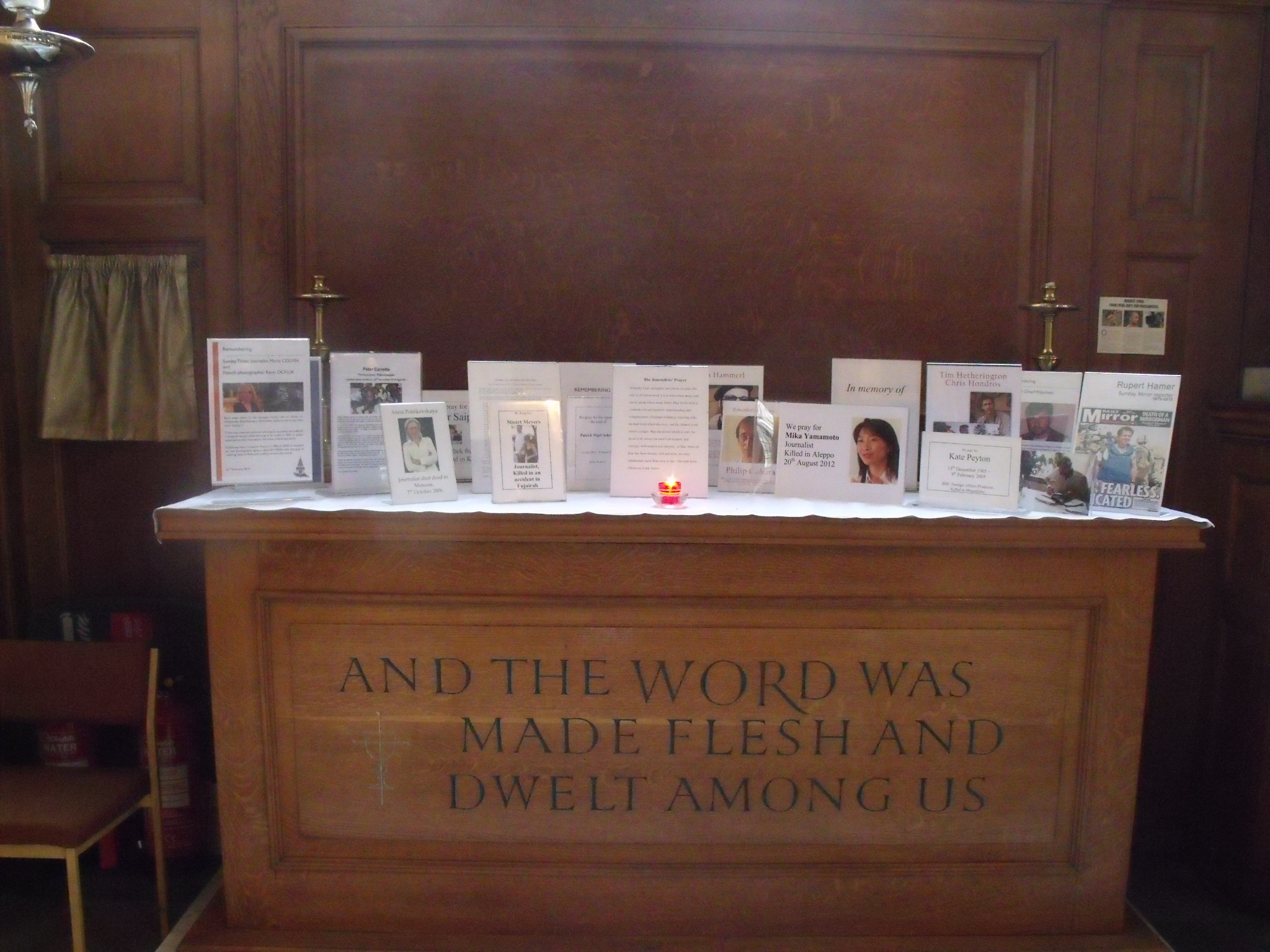 Happily, this church was open and is another one well worth a visit. It is known as the journalist’s church as befits its position it what was once the home of the print industry. Visitors are encouraged. In part this is by welcoming signs. Inside there is a bookstall with guidebooks, pencils, pens, mugs, CD’s, post cards, Prayer Books etc. There is a selection of children’s books and bibles too. Also the ‘New Daylight’ bible reading notes. Guided tours are arranged sometimes. The blessed sacrament is reserved here and there is a prayer board to leave intercessions on, as well as a votive stand. Two things especially caught my eye. The first is the modern stations of the cross which are some photographs. These really bring out the meaning of Good Friday. Then there is an altar with memorials to journalists, and other media employees, who have lost their lives in pursuit of their work. This is very moving and it was very noticeable what effect this was having on the visitors who stood and looked at it. It engendered a sense of prayerfulness. We are not always aware of the cost of our 24 hour news coverage.