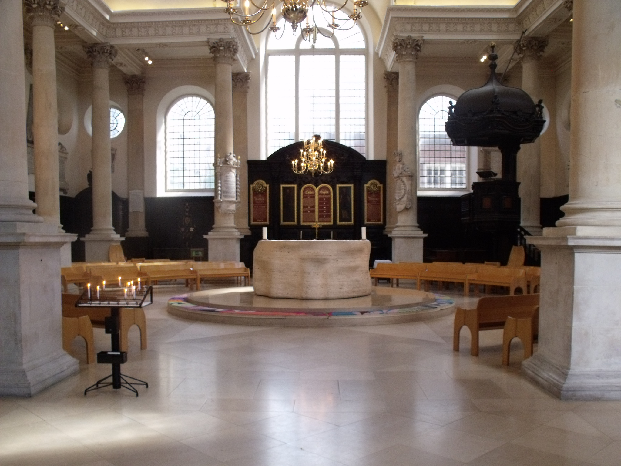 Nearby is another great church surrounded by yet more building. It is open on weekdays from 10am – 4pm. The doors were open to invite the visitor inside, and it is well worth going in. The interior has been re ordered with some notable fittings and furniture. The altar is particularly striking, being an eight ton block of stone carved by Henry Moore. The lovely modern pews curve around it. Inside there is a leaflet on Henry Moore and the church and some from The Friends of City Churches. They also sell key fobs for 50p each. I also picked up a postcard about the London Internet Church – www.londoninternetchurch.org.ukwhich is an initiative by the Diocese of London. St. Stephen’s is the home of this. Worth a look at. But to return to St. Stephen’s proper, their website,