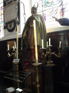 Yet another church surrounded by building work. St. Magnus is open Tuesday’s to Friday’s 10am – 4pm. The signs outside make this plain. It is certainly worth a visit. It is one of those Anglican churches where you are not sure if you have actually strayed into a Roman Catholic one. The scent of incense hangs heavy in the air and can be seen swirling in the sunlight through the high windows. There is much to see here. There are some church guides and gospels available, as well as some prayer cards. Also a leaflet on the Fraternity of Our Lady De Salve Regina which exists to promote devotion to our Lady through the singing, or saying, daily of the Salve Regina as well as prayer. The church website http://www.stmagnusmartyr.org.uk/ gives more details. I found some secondhand books for sale here. There are votive stands to use and many statues to look at. There is also a good model of the Old London Bridge. A prayer board can be used for intercessions.