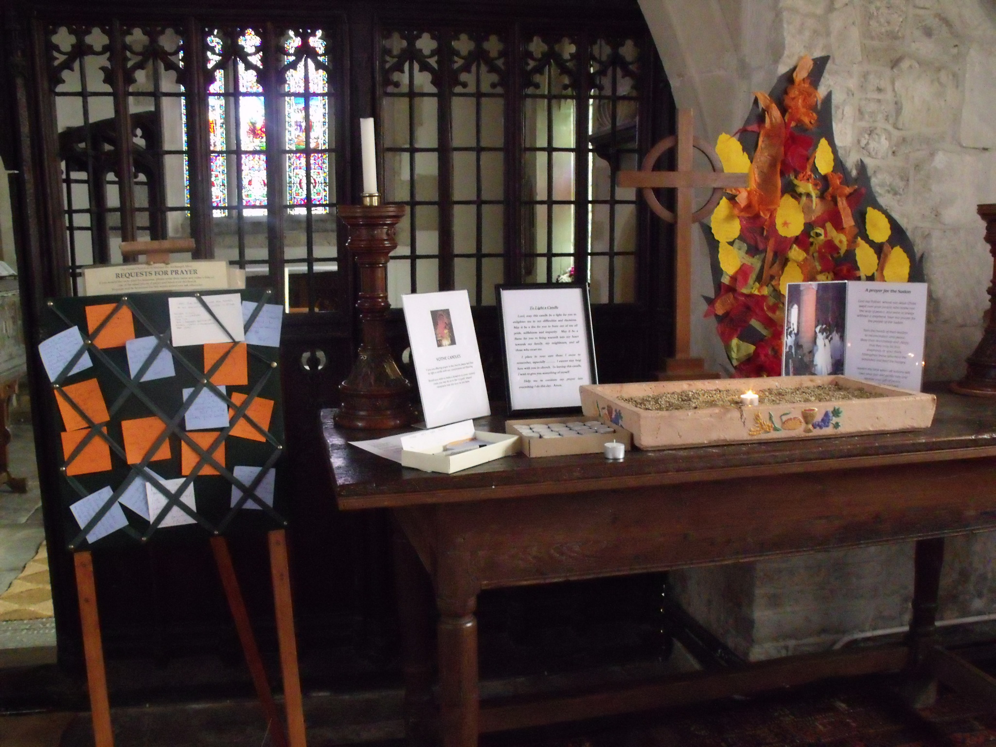 A magnificent, cruciform, church is this small Wiltshire town. It was open, as it is each day. Outside there are placed welcome signs to encourage the visitor inside. There were two friendly stewards on duty and I was handed a ‘paddle board’ to guide me around this interesting building. There is plenty to see and a real effort has gone into making a visit both interesting and welcoming. There is a guide book to buy, and some versions in different languages. Also for sale are cards, book marks, key fobs, tea towels and postcards. For children, there is an area left set up with toys and books etc. A Lectionary had been left open along with a card with the relevant gospel acclamation on it. There are two prayer books, which appear to be well used and a votive stand on which to light a candle. The Jesus Chapel is set apart for quiet prayer and this has a stock of prayer books to use. There is a history display and one on the church’s link with the church in South Sudan. This was interesting to look at. There are also pictures of the clergy and others involved with the life of this church. There were a few ‘Prayer Trust’ leaflets on the Christian faith. I rate the Abbey as very good and enjoyed my visit here. 60 people had signed the visitors book in the last month.