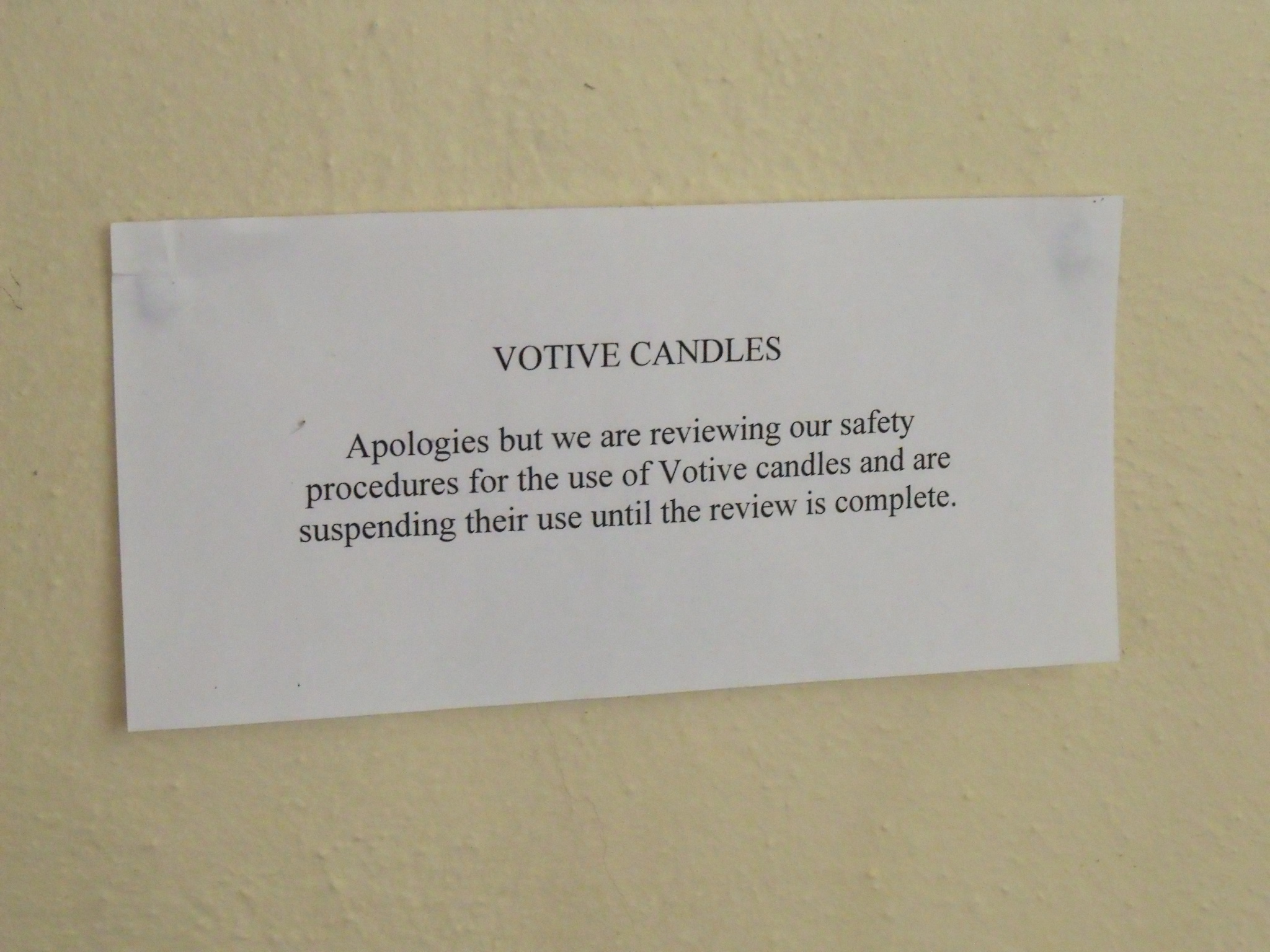 There is a prayer board, which is well used and a votive stand which had no candles. There was a reason for this – this is the first time I have come across this.