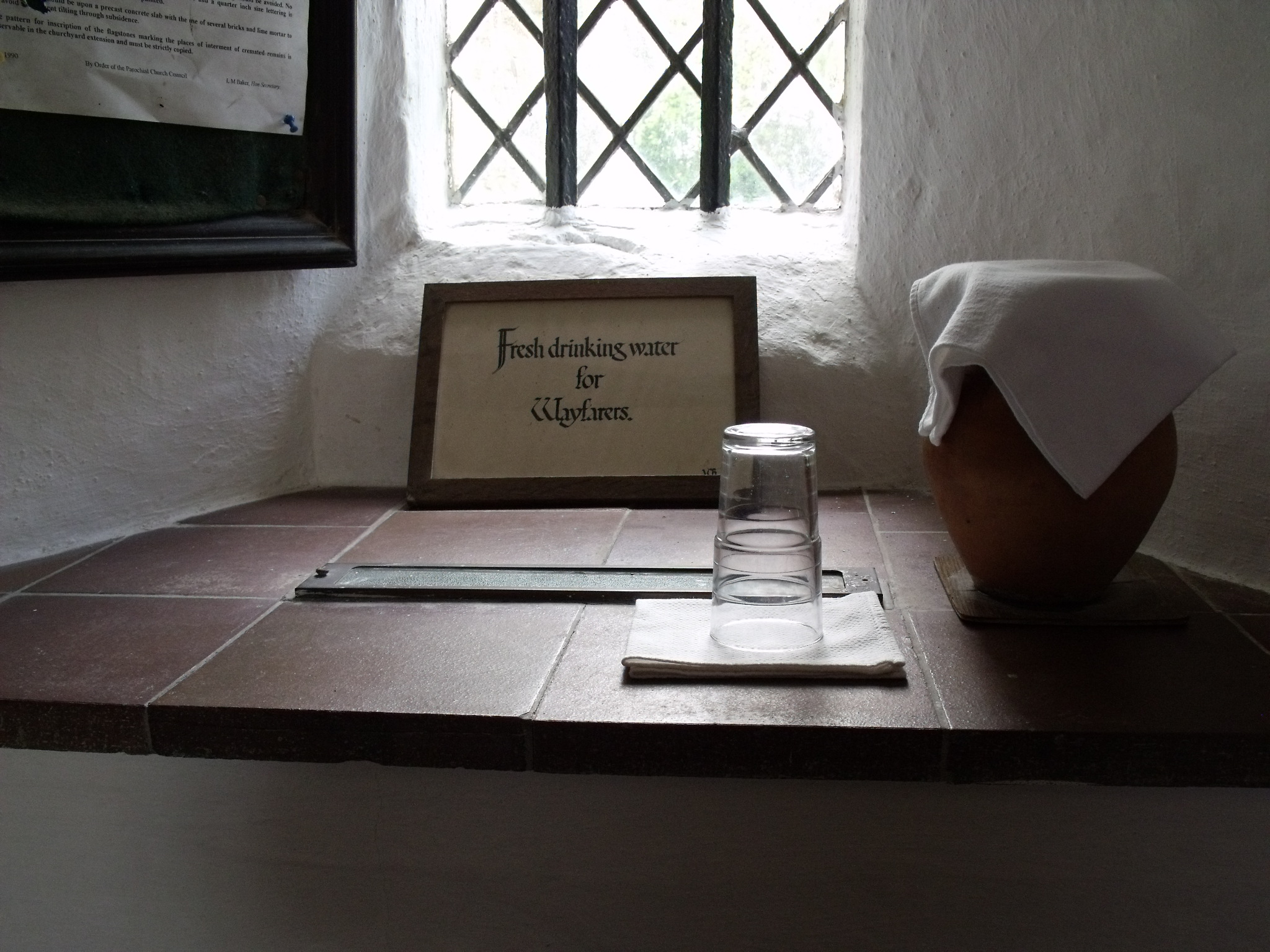 Once inside I found a glass and jug of water for thirsty wayfarers. There are some lovely etched glass doors into what is a delightful church. It is well worth a visit. There are cards for sale and some information leaflets on items of interest such as the ‘Penn Doom.’ Also some notable tiles.