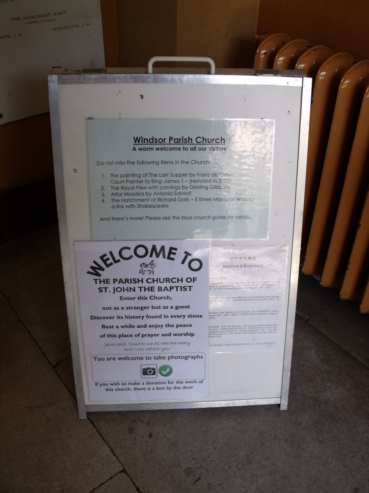 This is a very well visited church being just along the road from Windsor Castle. There were many visitors today from many different countries. St. John’s caters well for them. Outside there is a clear sign which says that the church is open and welcomes visitors.