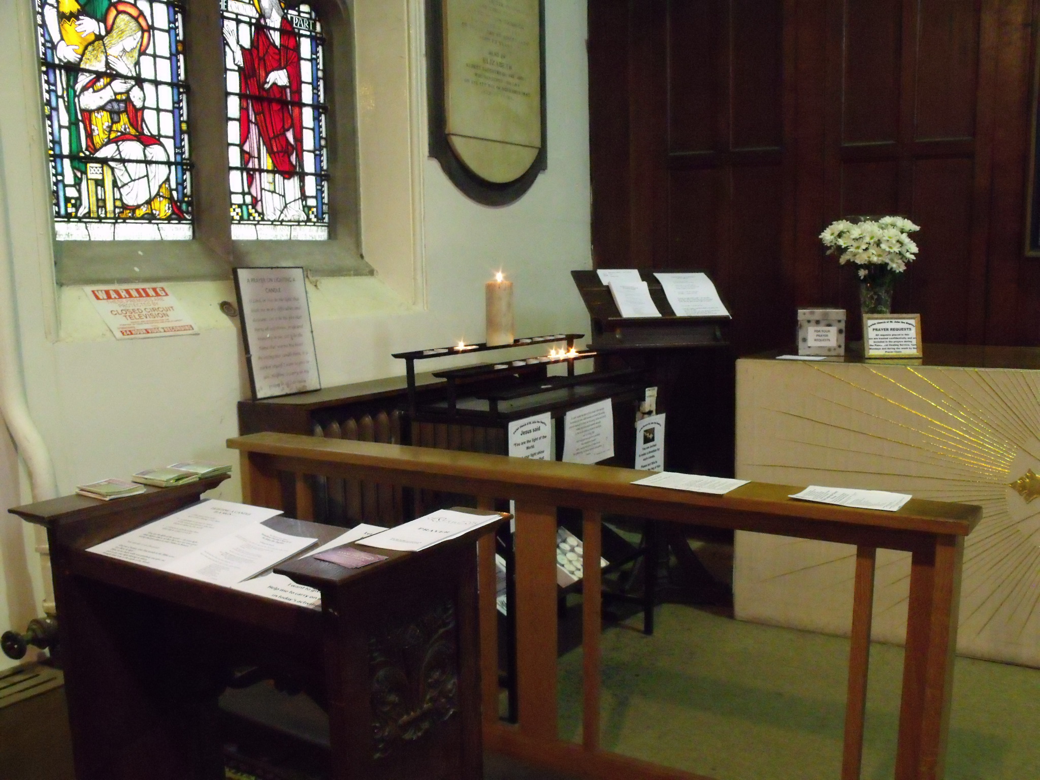 There are 2 prayer request boxes and a votive stand to use – all in use.