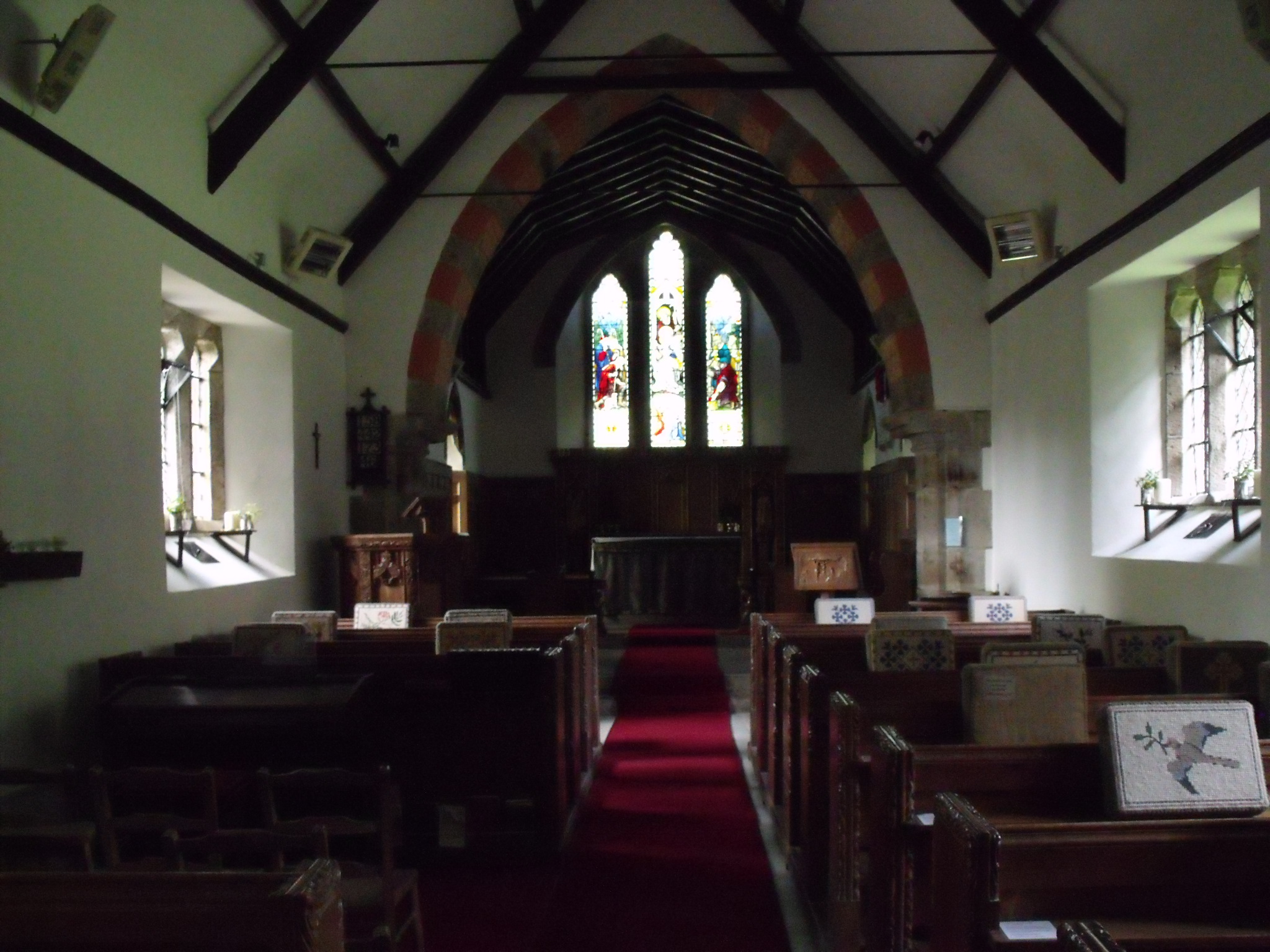 It is open and inside is a simple, well loved building. Being a Devon church it has lots of wood carvings. These were done by a Miss Pinwell, daughter of a former vicar. There is a simple guide sheet which explains how St. Gabriel’s was once the village school and church but, after the school closed in 1934, it was just used as the church. There is a pilgrim’s prayer on the wall. The church features bright kneelers each of these records it’s maker on the back. A lovely idea. There is a copy of the original licence to build the church framed on the wall. The flowers are arranged in tin cans – perhaps these had been for a wedding? Anyway they add a homely touch to this simple church.