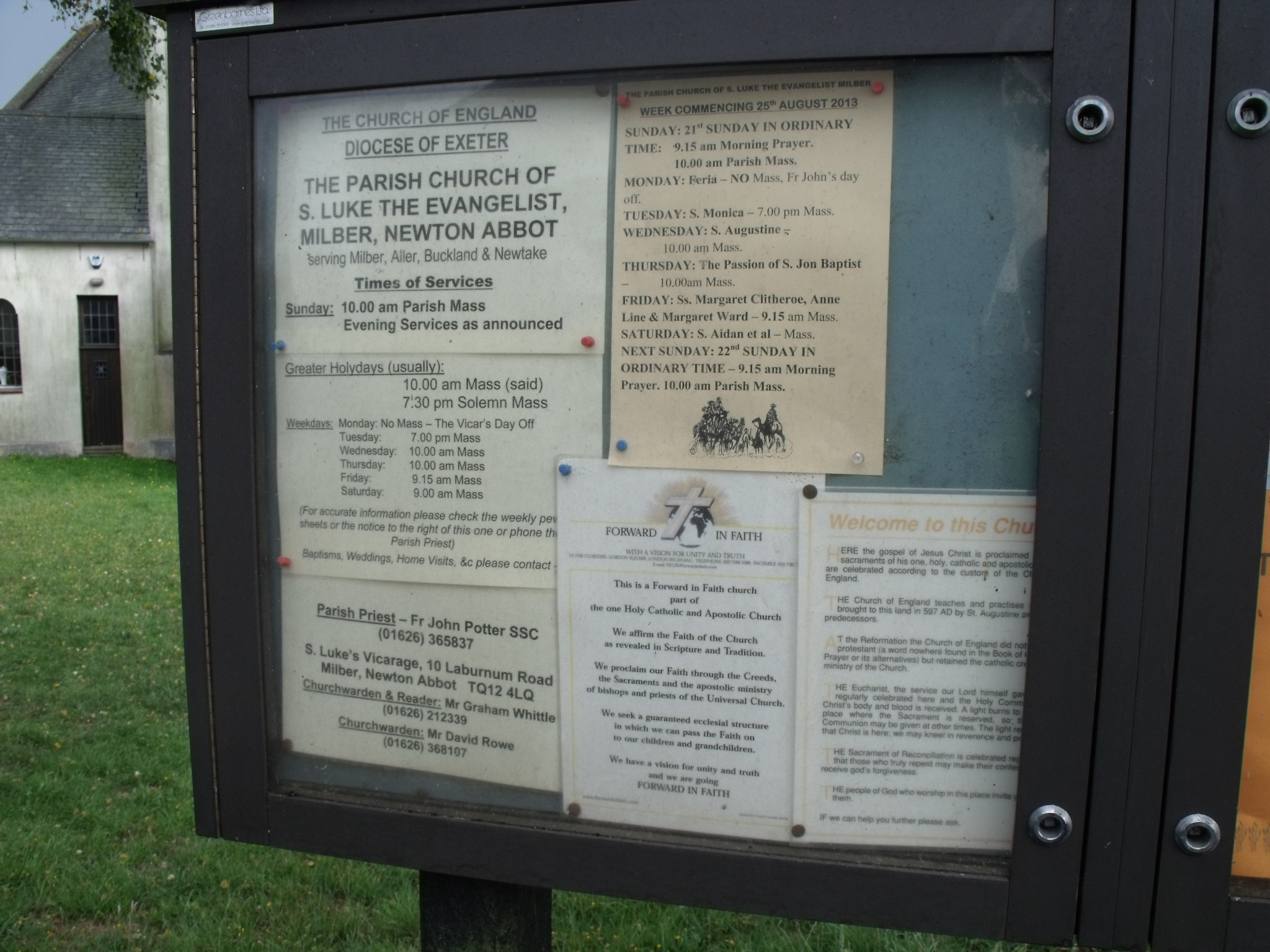 St Luke’s is part of the See of Ebbsfleet, i.e. rejecting the ordination of women. I daresay they don’t want any unsuitable people in their church. We cannot tell of course whether they fear local vandals or theological vandals, but to judge by the fortress-mentality you encountered they certainly fear something, and as you say the unwelcoming air of the place is not going to endear them to the people of Milber. A shame, because the church is modestly famous and a warmer welcome might attract many more visitors.