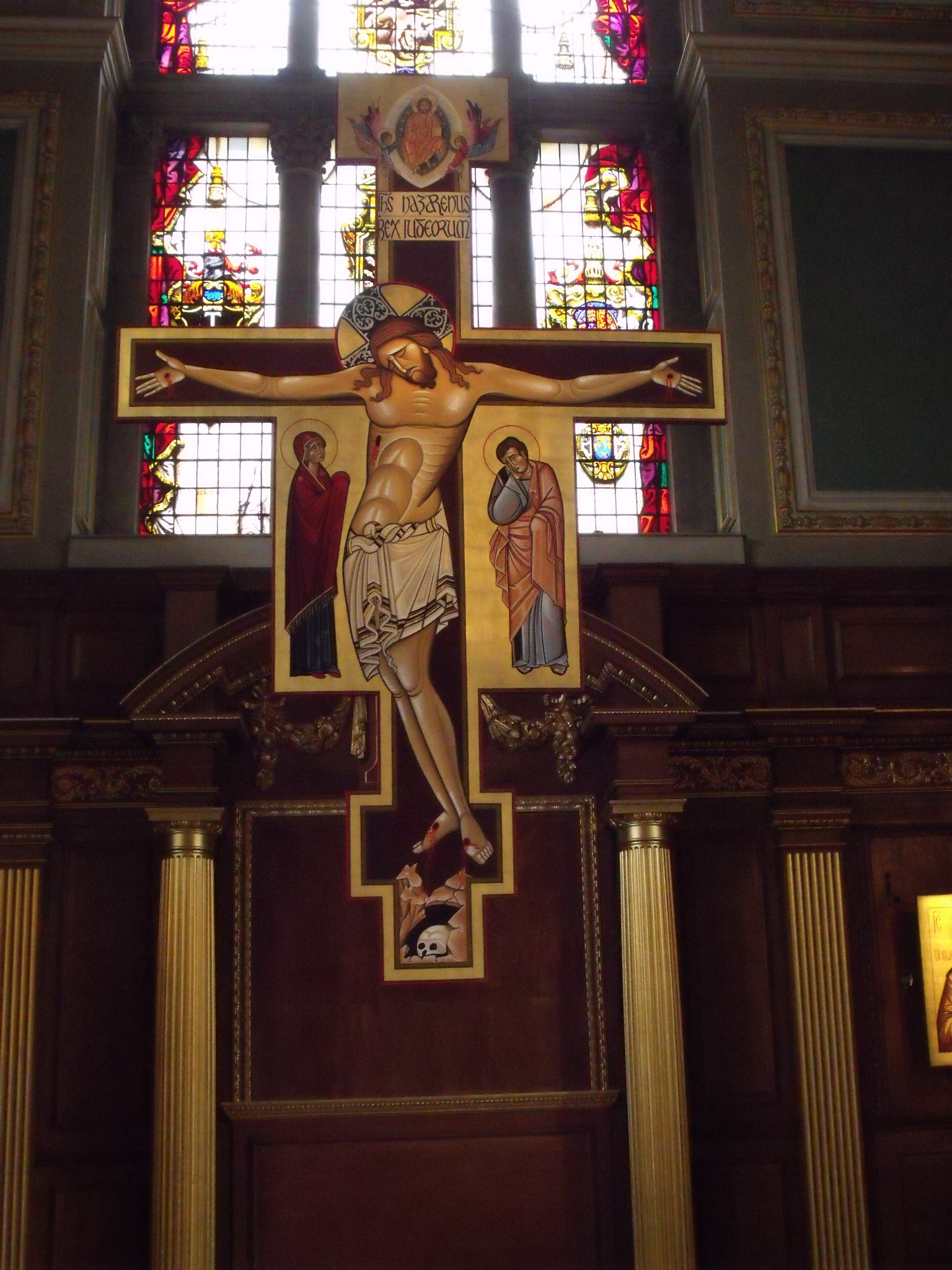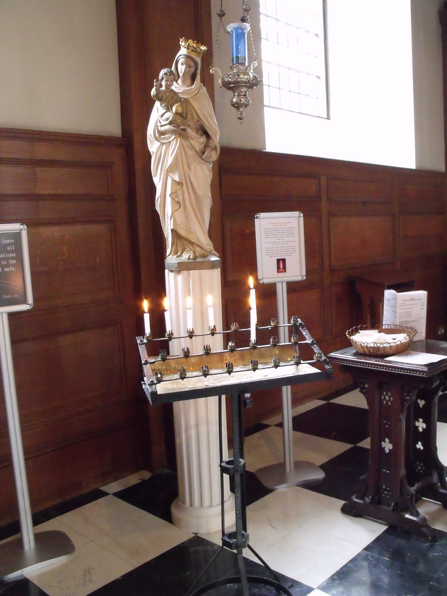 Inside, there are gifts and cards etc. to buy – a pretty good selection of items and these are well displayed. There is a free colour guide which gives good information about the church and it’s activities. Also a Lent Book – ‘This is the Word’ for which a donation of £1 is requested. This is very good indeed and also worth pondering over. This all points to a church which takes it’s visitors very seriously. This is one of several things that set this church apart from many others. There are some stunning icons here which were written for the church by the Monastic Community in Vallechiara. They are well worth spending time with. A leaflet outlines their meaning. There are also leaflets on ‘Places to pray’ within the church and another which points towards ‘Three Points of Prayer’. These are an icon – ‘Our Lady of Inexhaustible Grace’, The Tabernacle in which the blessed sacrament is kept (this was created for Stewart Headlam) and ‘The Statue of our Lady’. A a votive stand sits in front of a statue of this. You might gather that this is not the most Evangelical of churches…