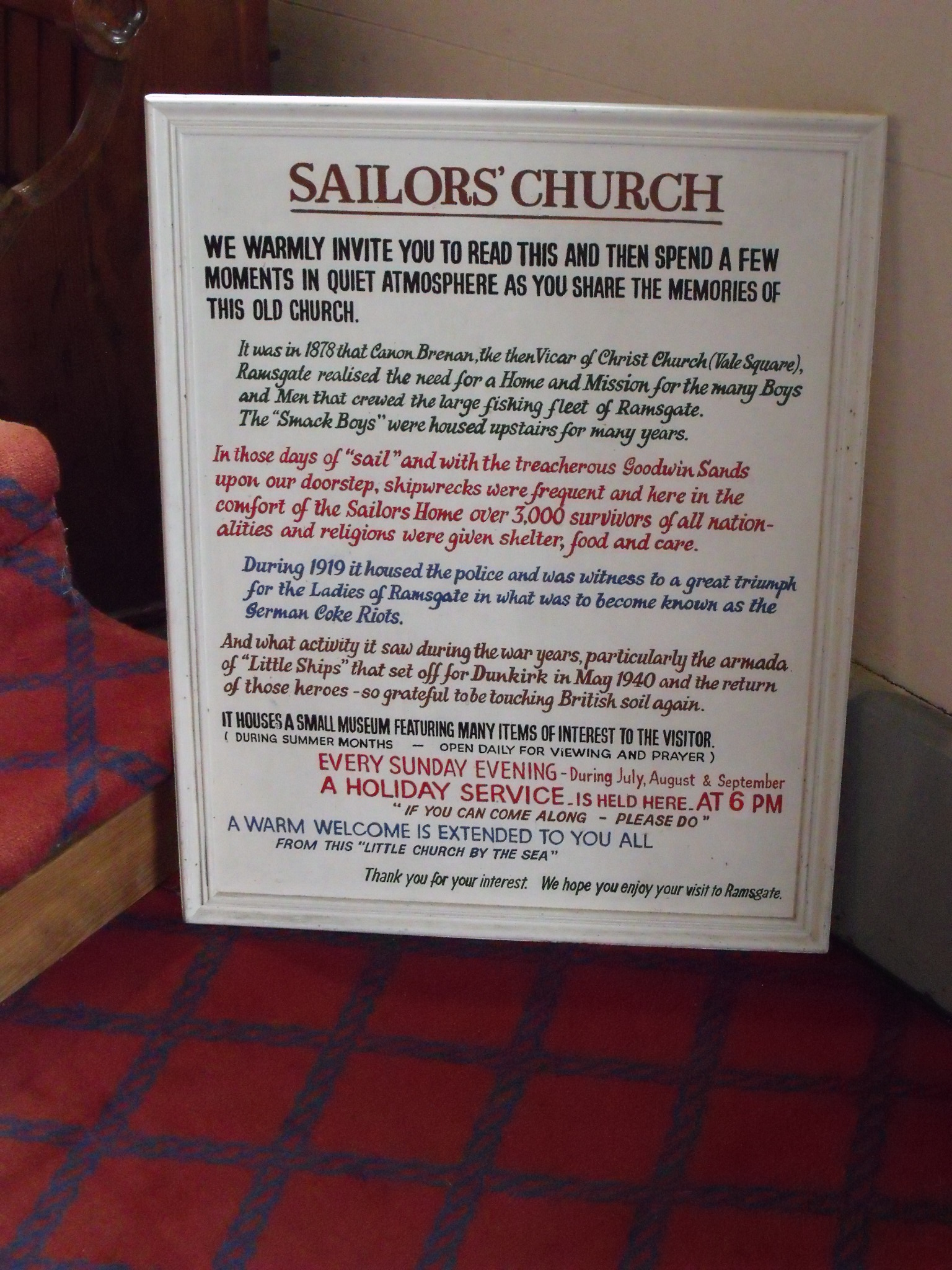 Also, there is a small museum of model ships and historical information. It is well done. Somewhere to leave some prayers would be good but I do rate this little church as good for this study. It comes under Christchurch, Ramsgate and the website is at http://www.christchurchramsgate.co.uk There is a bit of information about the Sailor’s Church but no visitors information as such.