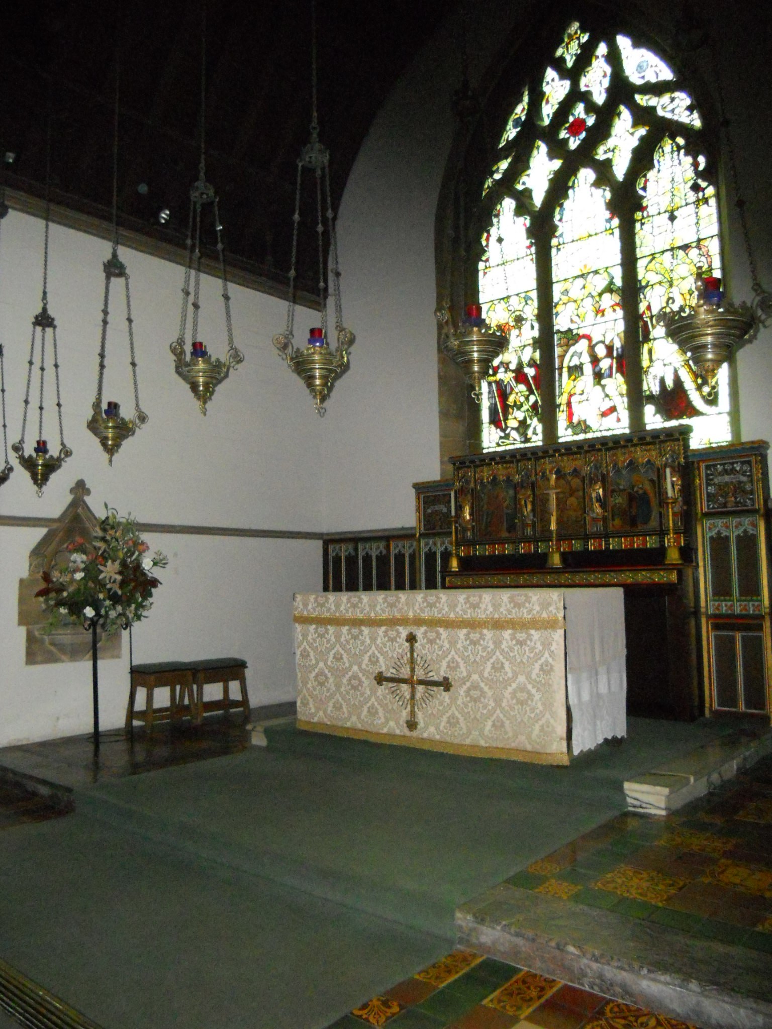 I visited on a dull day and when I opened the door into the church I found the interior rather dark. However, walk a couple of steps and some lights come on automatically. They could do with staying on a bit longer but are certainly needed here.