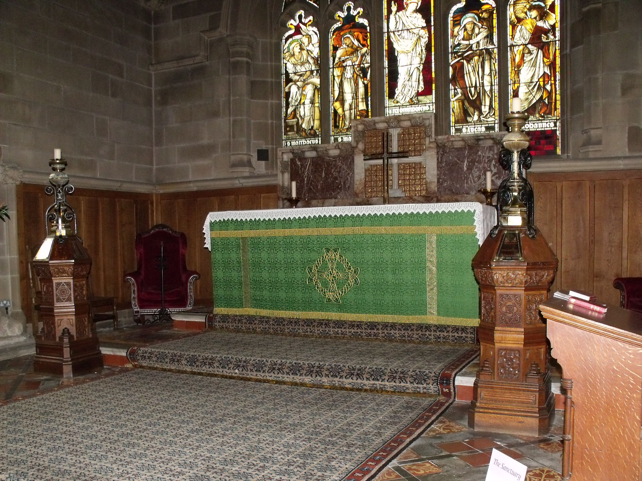 In the sanctuary are some rather strange ‘candlesticks’ dating from 1875. The East window is an Edward Burn-Jones design made by William Morris and co in 1876. It is worth a good look at.