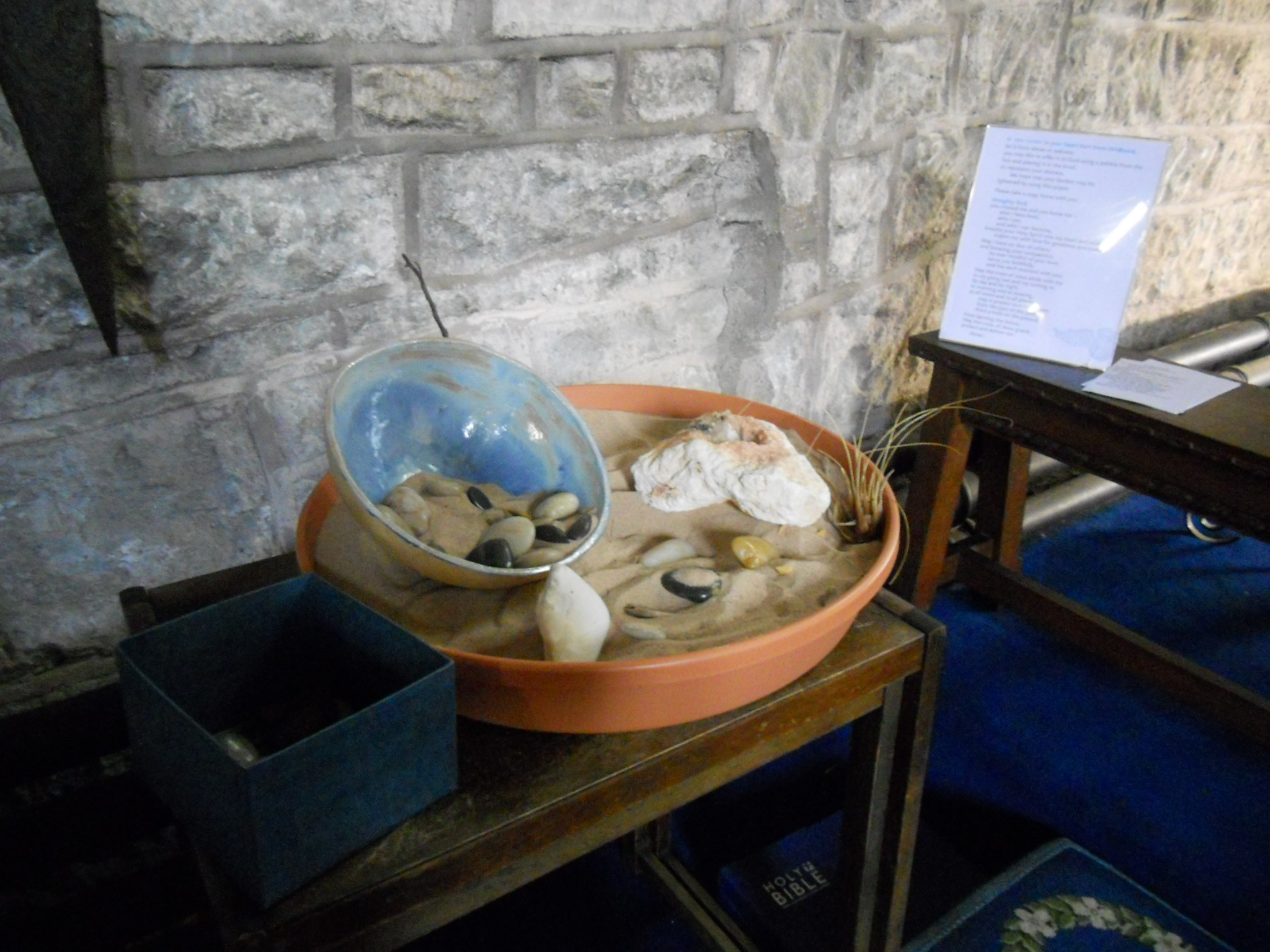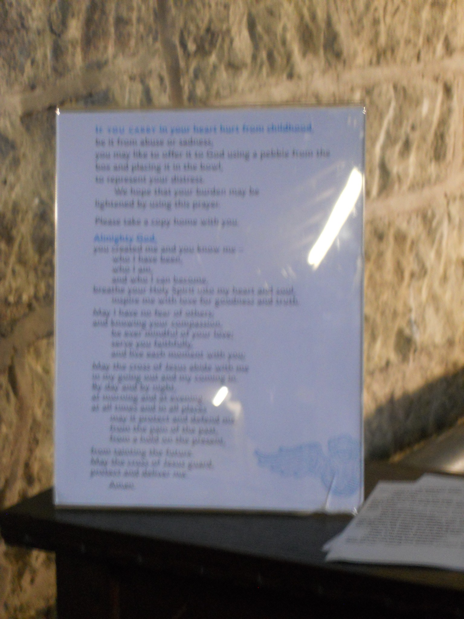 21 visitors had signed the book in July. Some lights were left on to help the visitor see what was what. A well used prayer book is available to enter prayer requests in to. The memorial book was open on the days date but there is a folder giving a photo of each page of the book so that people can look up the relevant day – a good idea. There was also something else I hadn’t seen before here. A prayer ‘station’ for those who had suffered hurt from child hood’. There are pebbles to lay down as a way of praying. Imaginative and very moving. It is well used.