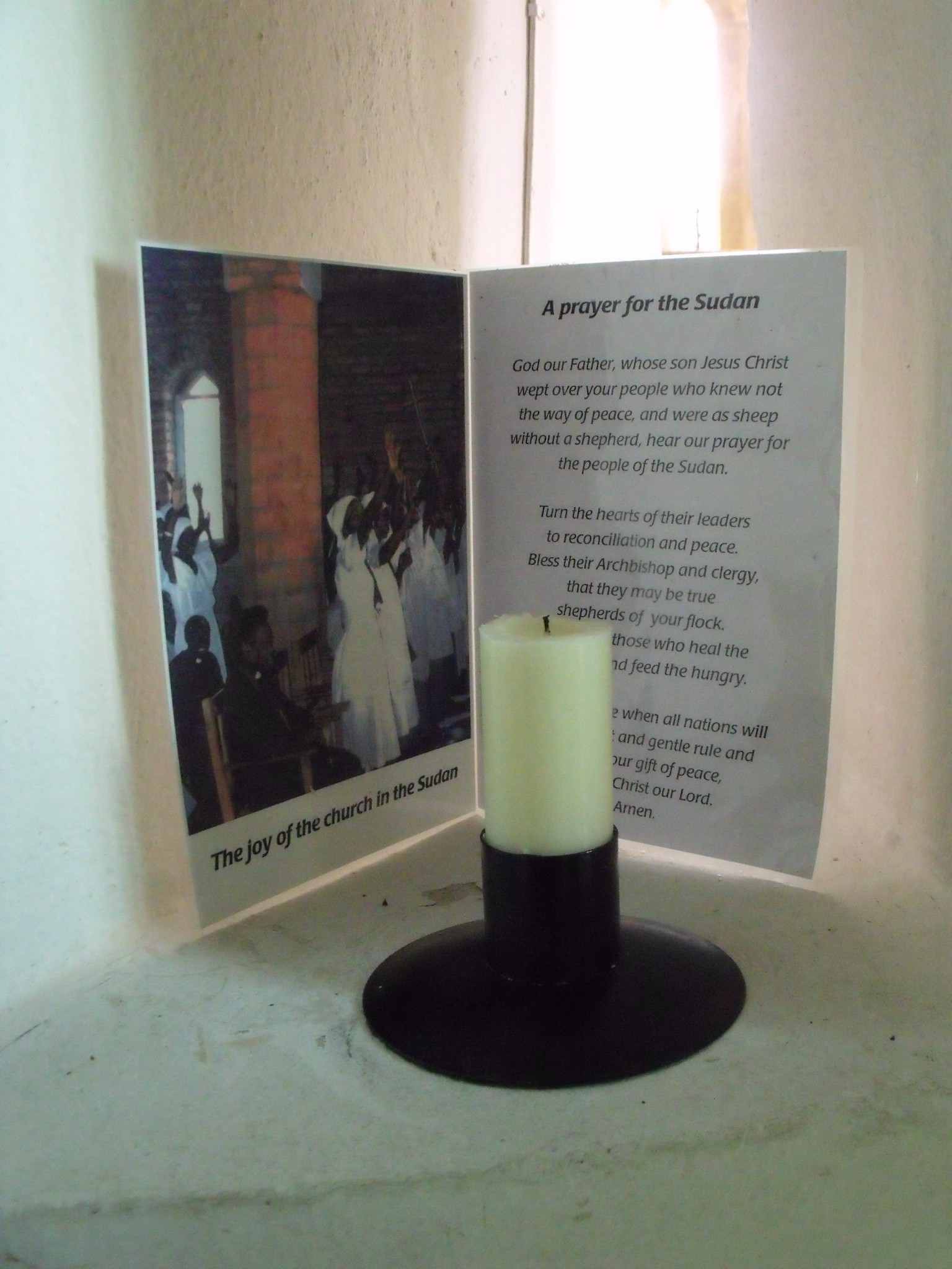 Inside I found that the guide had sold out but there is a ‘bat’ to wander around with. There is a prayer area here and some nice modern furniture – churches are often good patrons of furniture makers. Prayer requests can be left here and some 8 people had signed the visitors book during July. Also, there is a simple display about a link with Sudan – a place which needs much support and prayer.