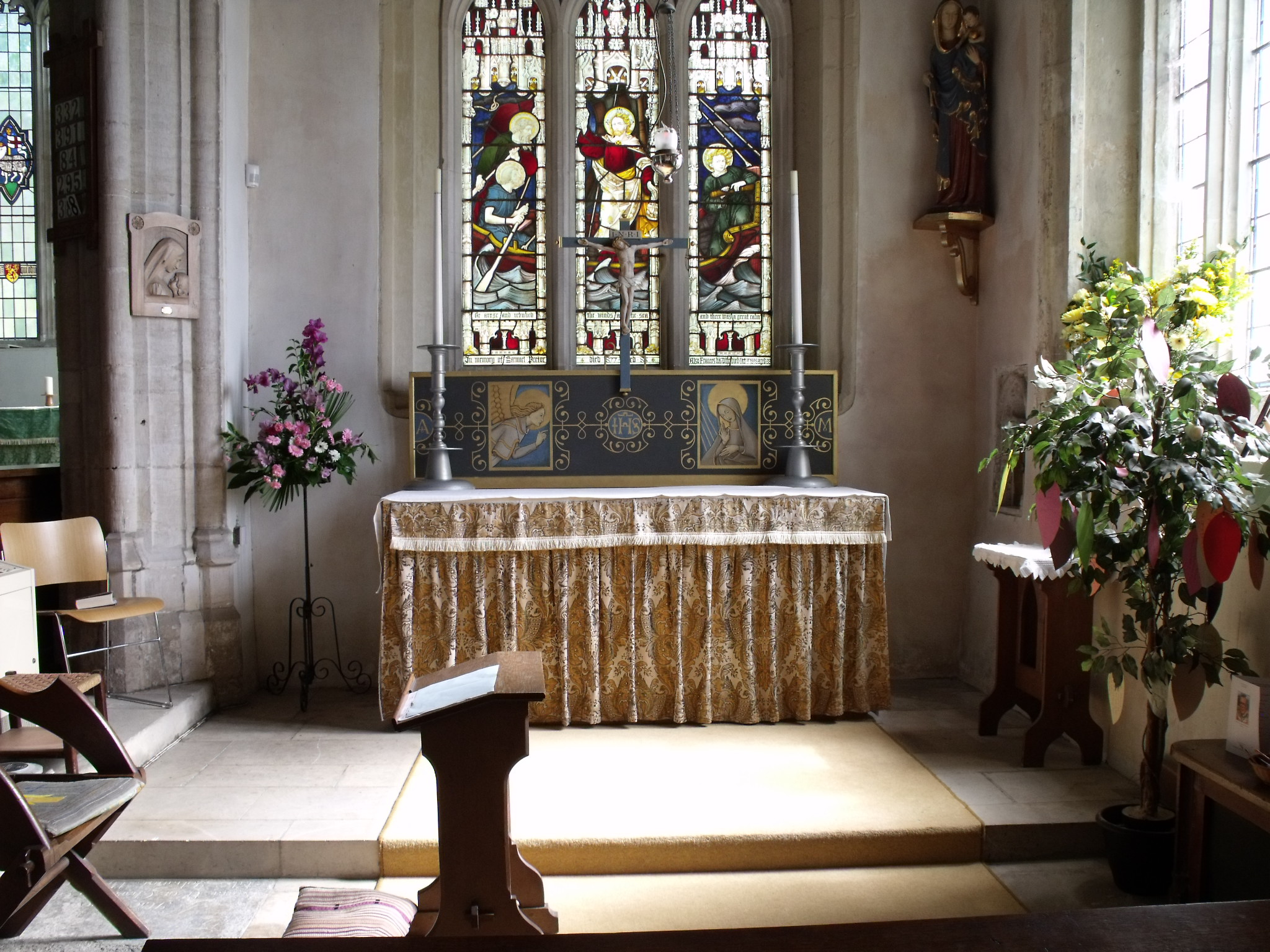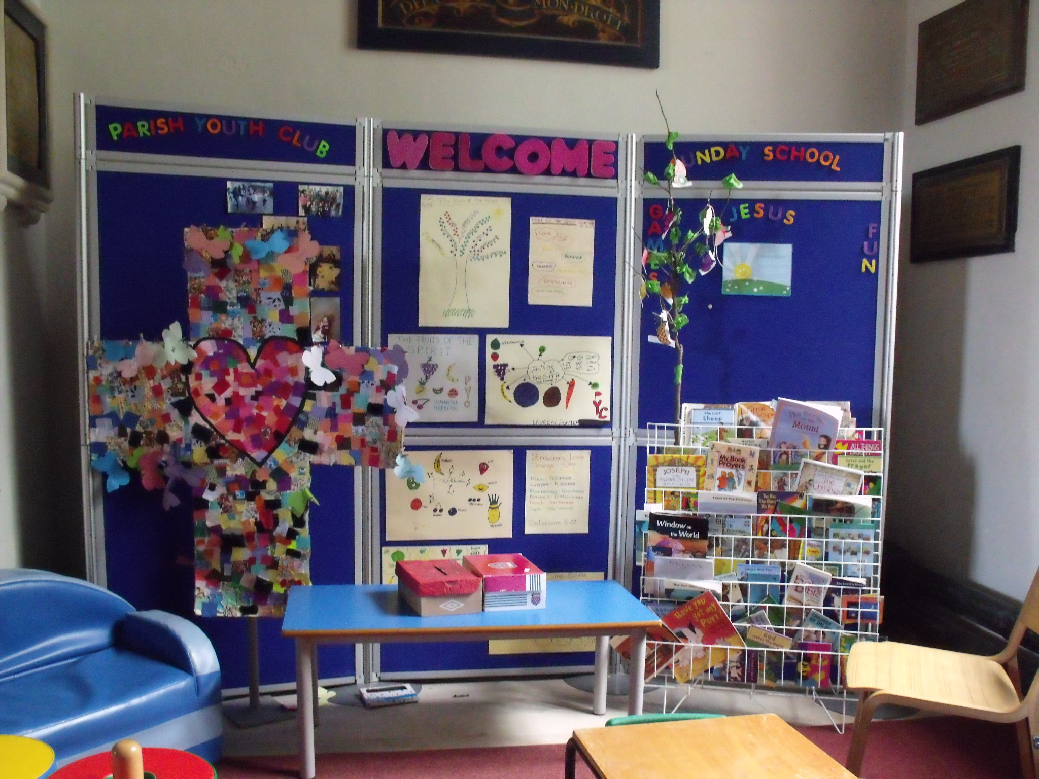 There is a display of church life and votive stand and pray tree for those who wish to pray. Some good children’s work is shown. Also a display about a link with Sudan. The blessed sacrament is reserved here.