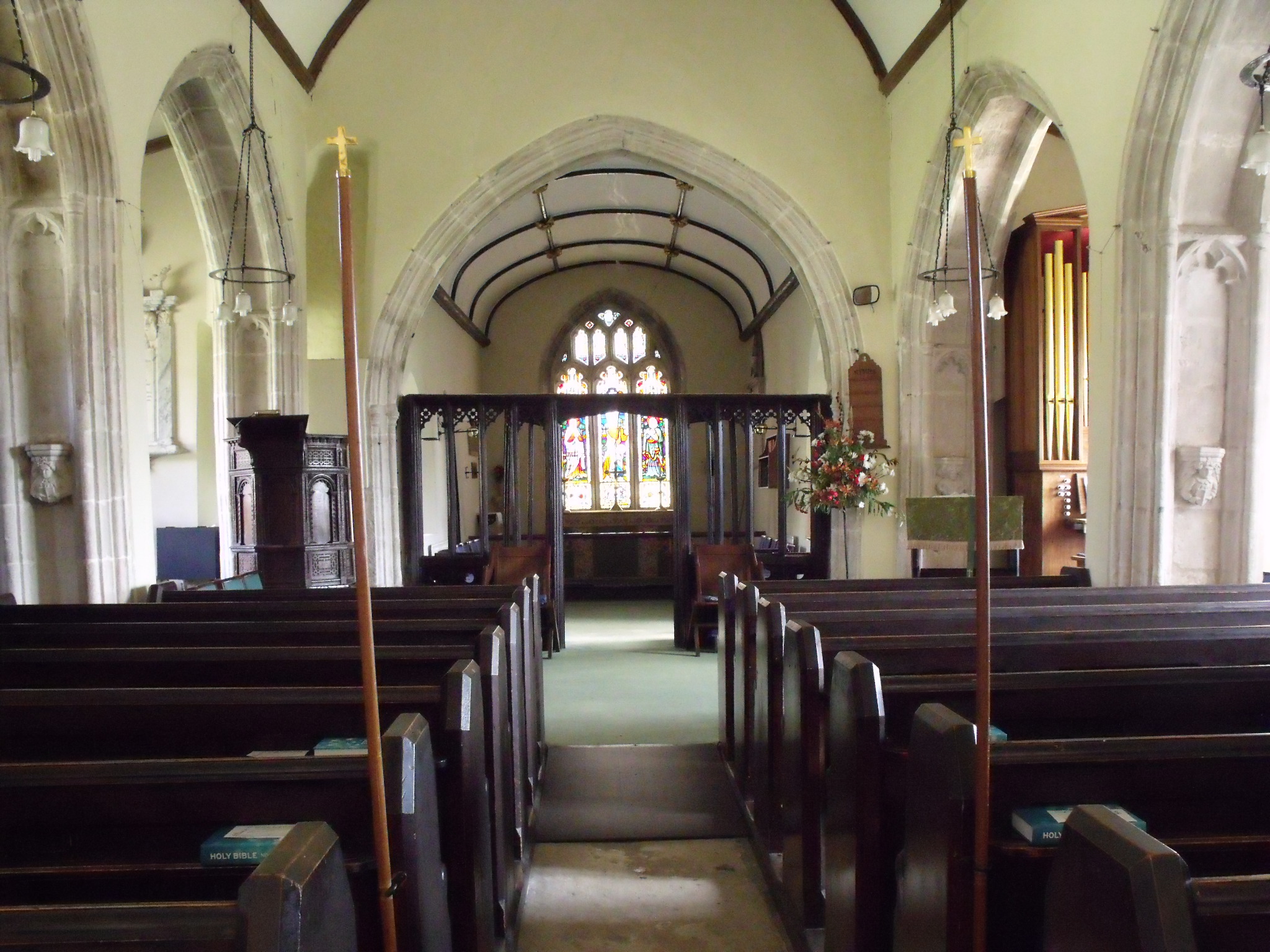 A pretty church in a pretty village. It is open and worth going in as there is plenty of interest here. The notice board only gives service details. Inside, there is a guide and postcards and some local history booklets – churches have an important role as centres of local history.