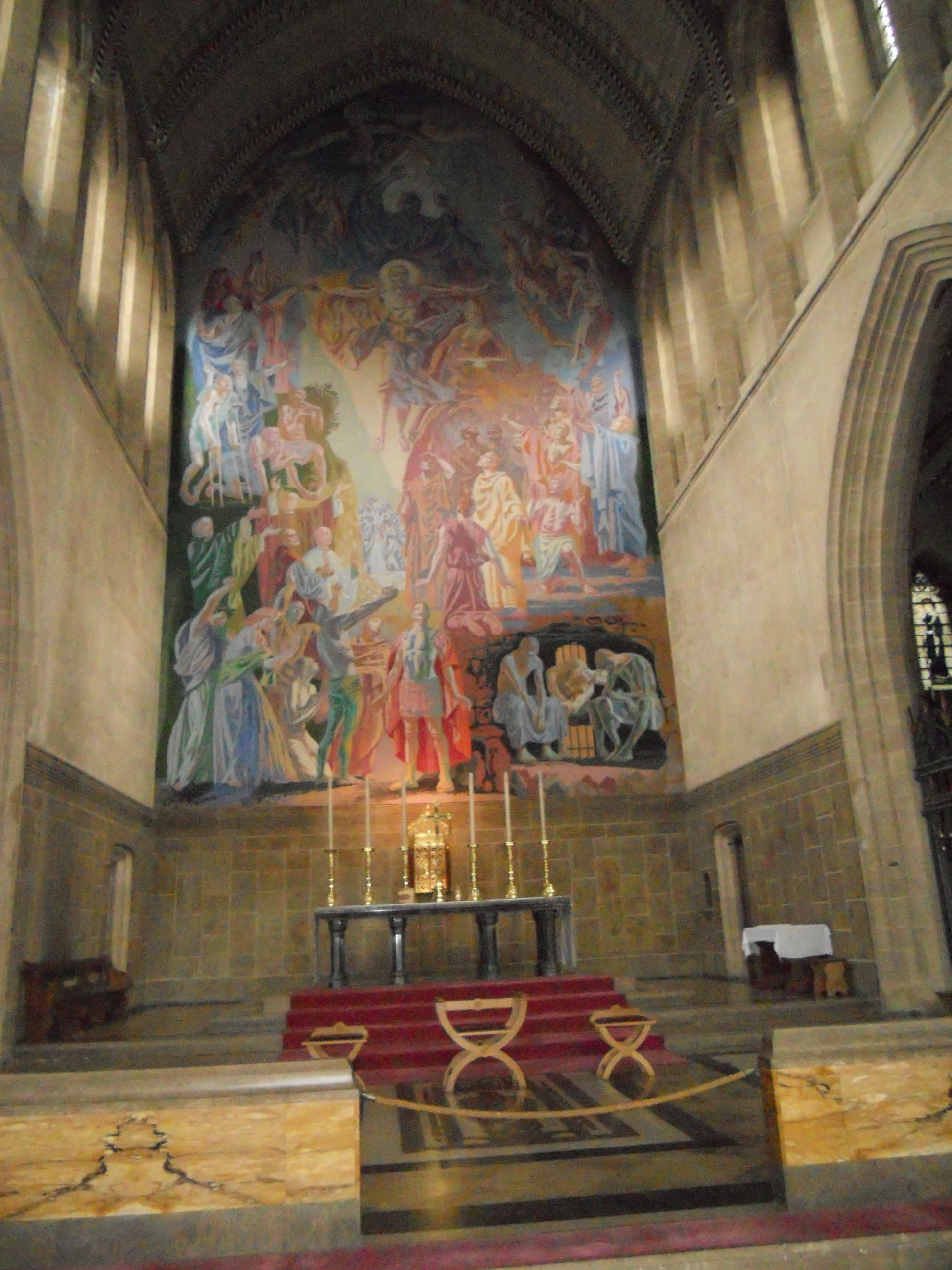 Inside the church proper, there is a dimly lit chapel on the right hand side – the Mackonochie Chapel which contains the effigy of Fr Alexander Mackonochie who was the first vicar here who promoted the Catholic strand of the Anglican Church. This was unfortunately locked. On the other side a door opens into the church itself. The interior is stunning as the East end is dominated by a 60 foot high mural, ‘Trinity in Glory’ by Hans Feibusch again. It is wonderful and repays careful study.