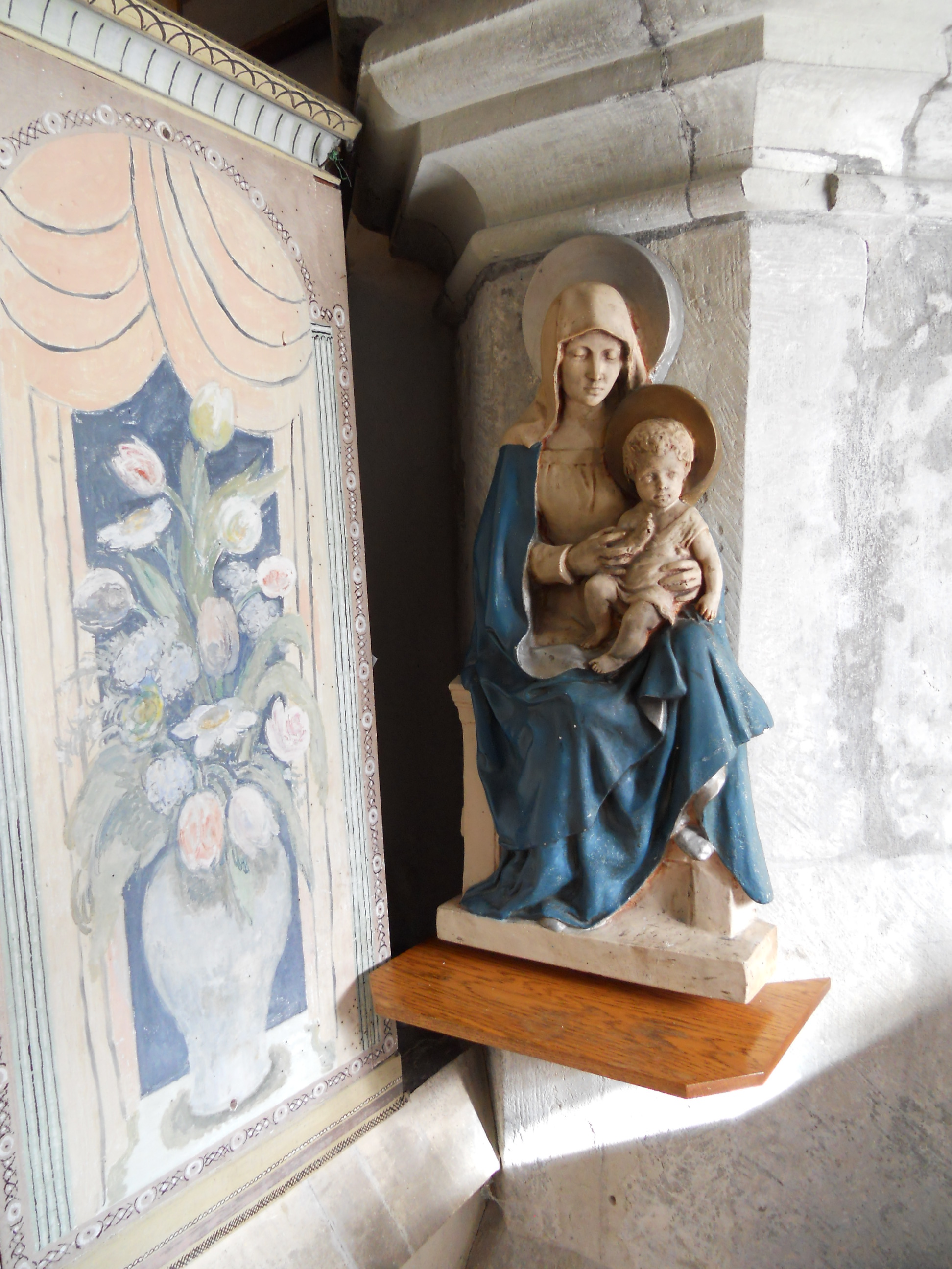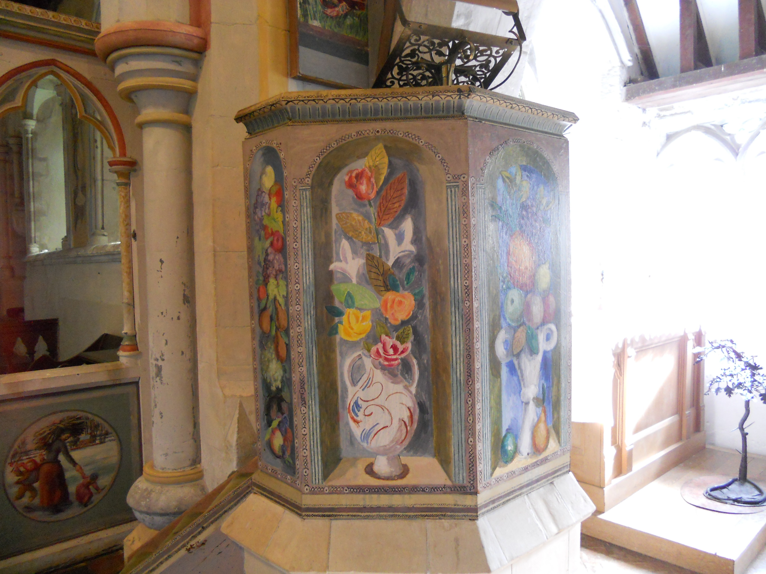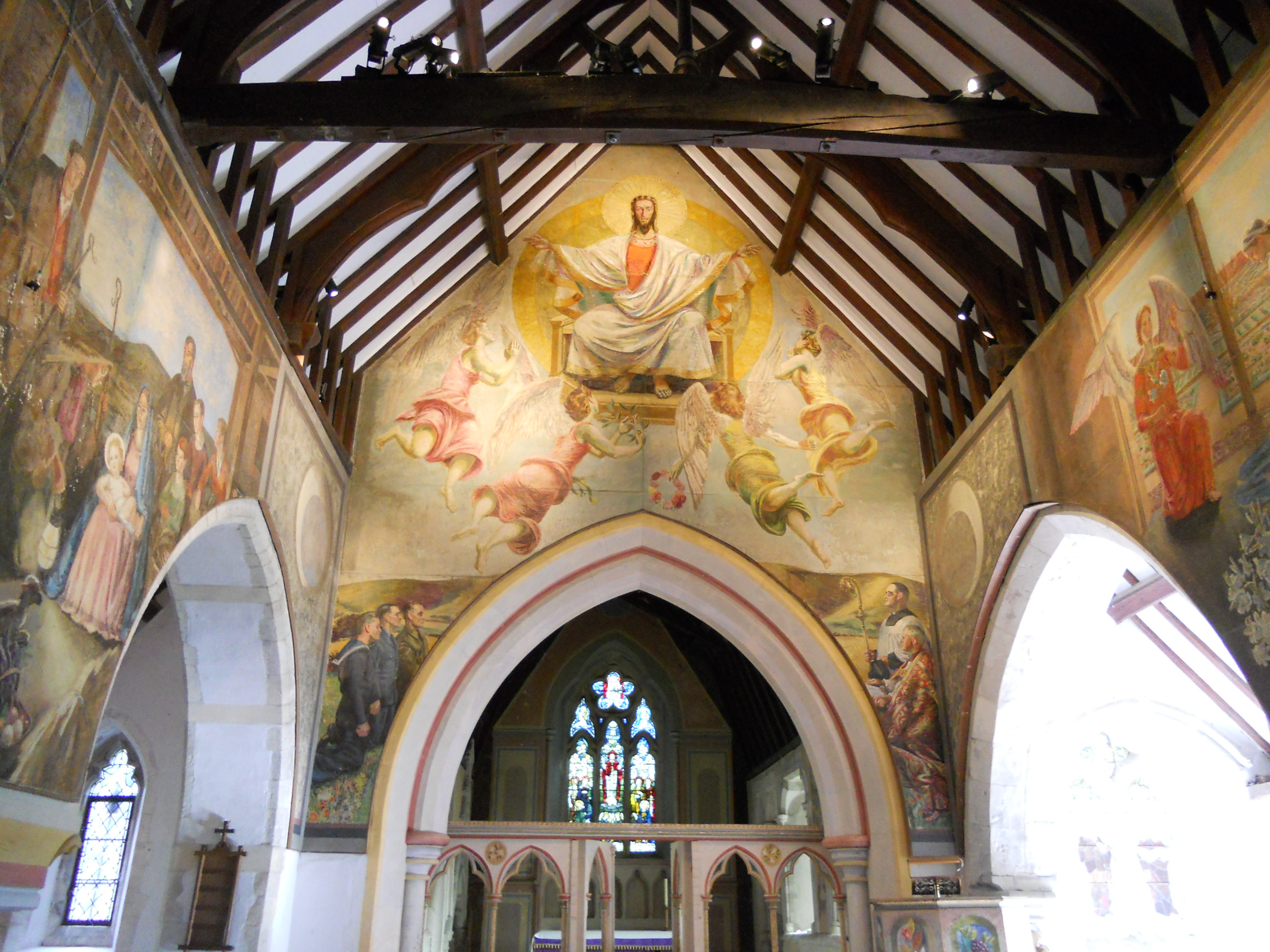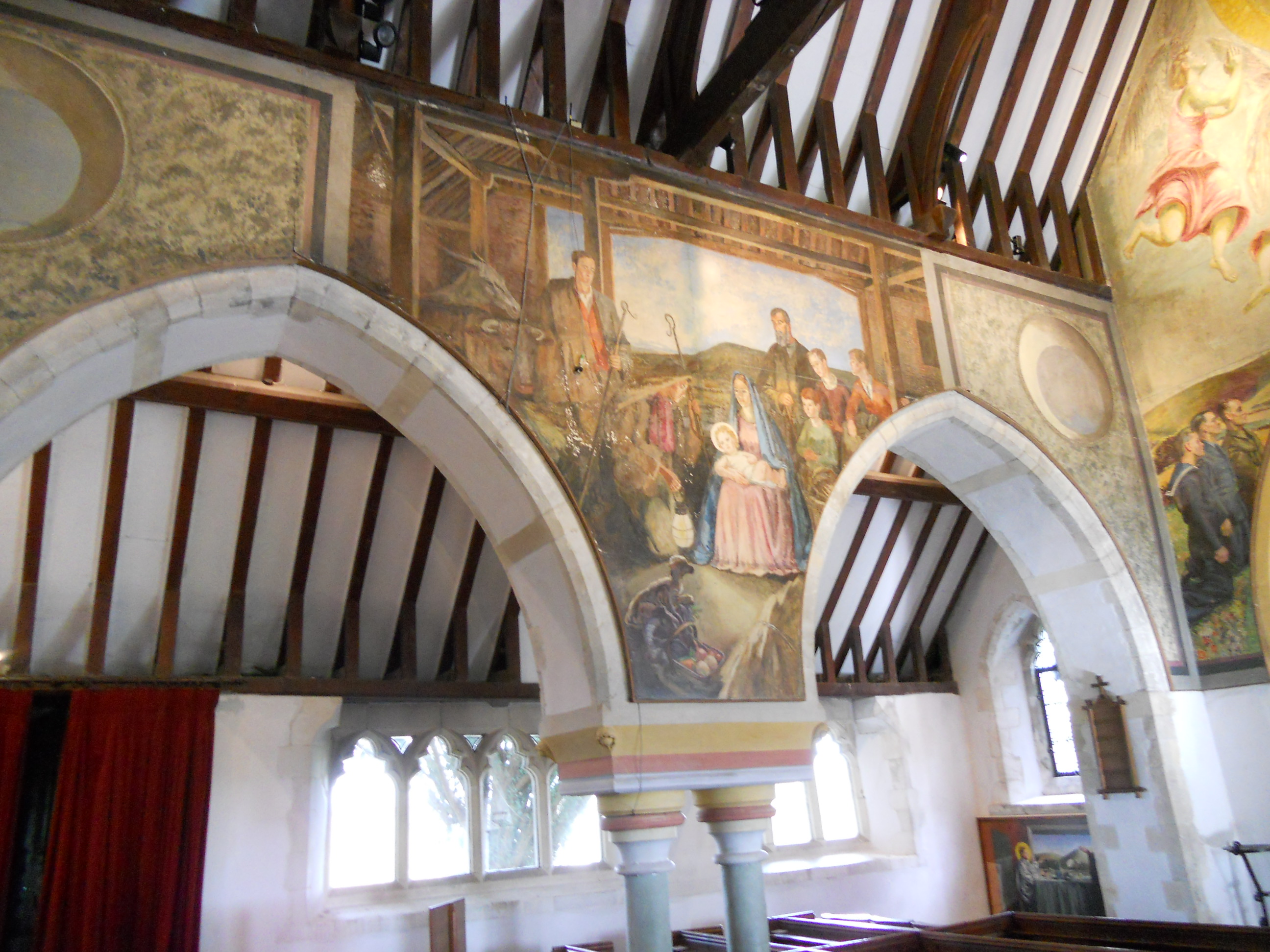 Again, there are some instructions about how to put on the lights – these reveal a remarkable interior. This is covered in painted murals which were painted during the second world war by the Bloomsbury artists. Bishop Bell of Chichester wanted to revive the tradition of wall painting and Berwick was hoped to be an experiment which would inspire others. The murals depict local scenes and local people. They are very interesting.