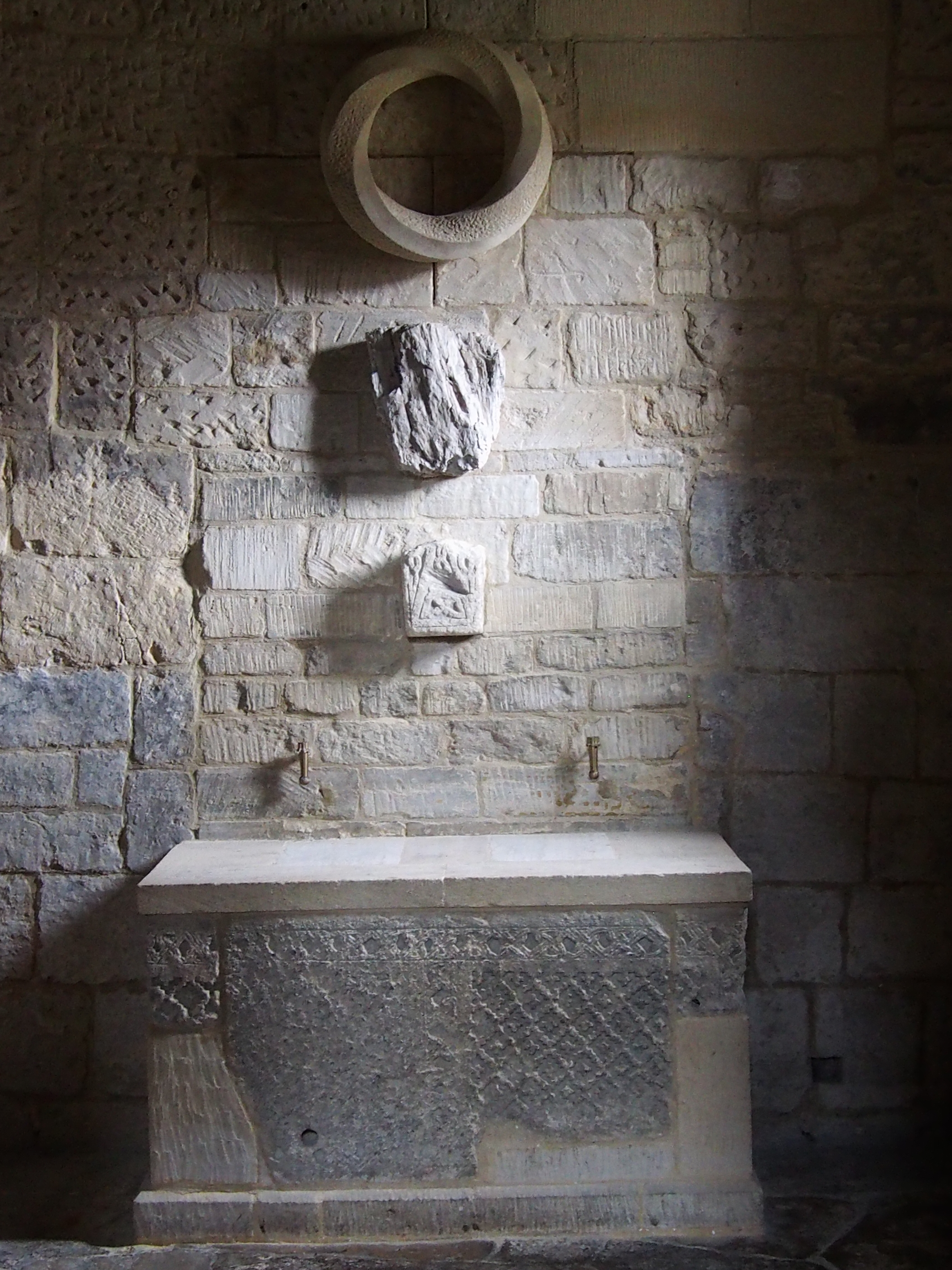 This is a remarkable place and a definite ‘must see’ for any church enthusiast. It has also recently become a ‘Small Pilgrim Place’ (see http://smallpilgrimplaces.org/). It is ancient and mysterious with a stark simplicity. There is not much inside but that is part of it’s charm. There is a small history display some postcards, a note about Small Pilgrim Places and the guide. This is a place to sit quietly and reflect on the ancient roots of the Christian faith. The display above the altar is a ring of Doulting stone by John Maine RA which was carved in 2012. Below it is a piece of fossil tree and fragment of a Saxon cross. It provides a good focus.