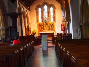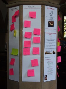 St. James is open each day and is well visited – several people came in whilst I was looking around. The visitors book only showed 5 entries for July, which goes to show how poor a guide to numbers these are, although one of the people did write in it and put ‘I love this church’. The door was left open which does tempt people in. There can be a reluctance to open the door for the first time. Inside, there are some guides and a small library which simply says ‘Please take and read’. Some lights were left on which helps to give a welcoming feel as well. There is a guide book and a good welcome leaflet which outlines the many activities that go on here. This appears to be a church which tries hard to be at the centre of the community here. There are two votive stands to use and an open bible as well as the ‘Saints and Pilgrims’ book. One thing which I thought was a good idea was some prayer boards made around a pillar. There were sections ‘In Thanksgiving, The Departed, The Sick…, Special Needs or Concerns’. There is a picture below.