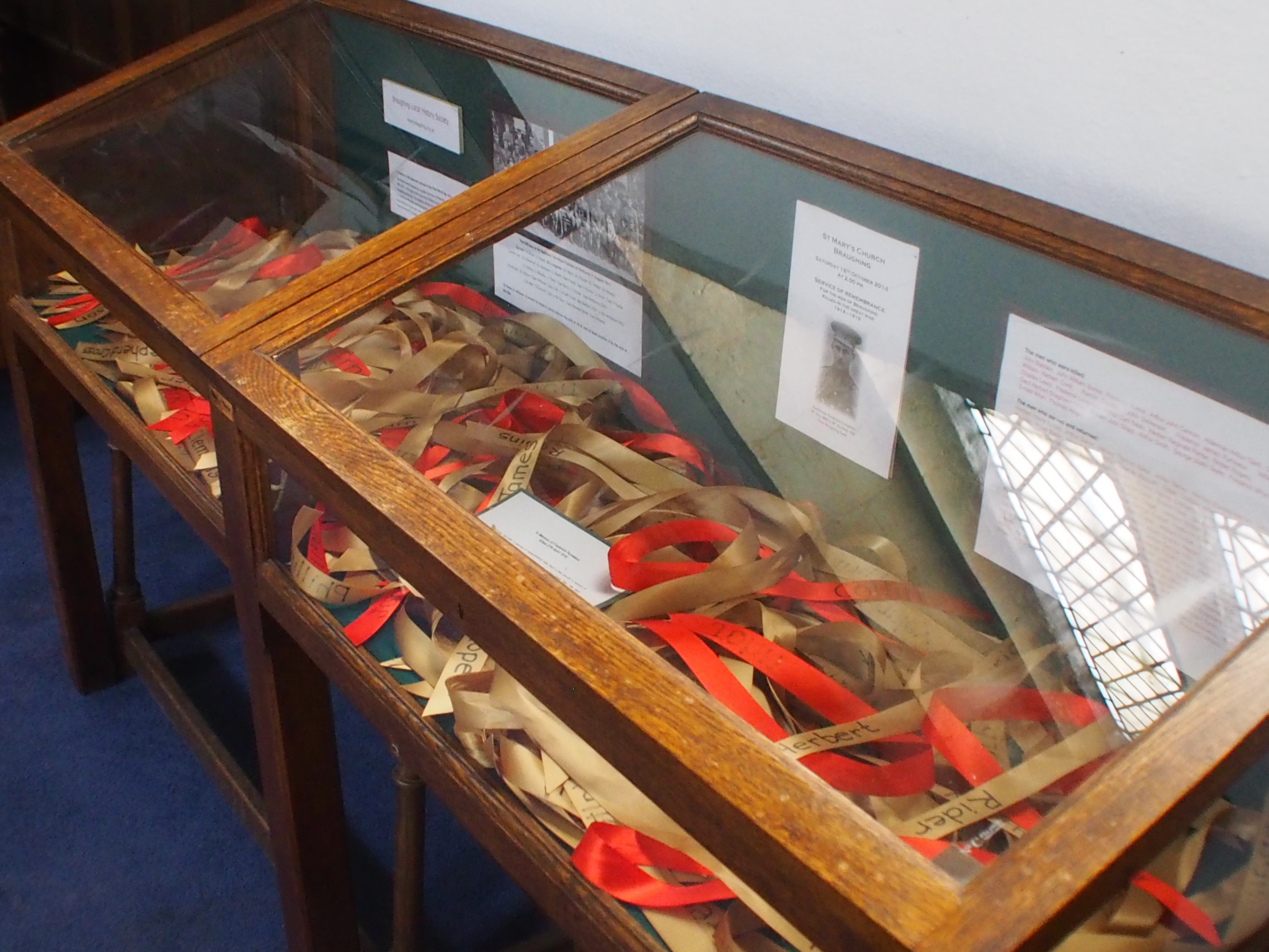 A lot of effort has gone into another World War 1 display. This consists of a glass topped display cabinet with a lot of ribbons in it. The gold ones are for those who served from the village and the red ones represent those who died. An excellent idea.