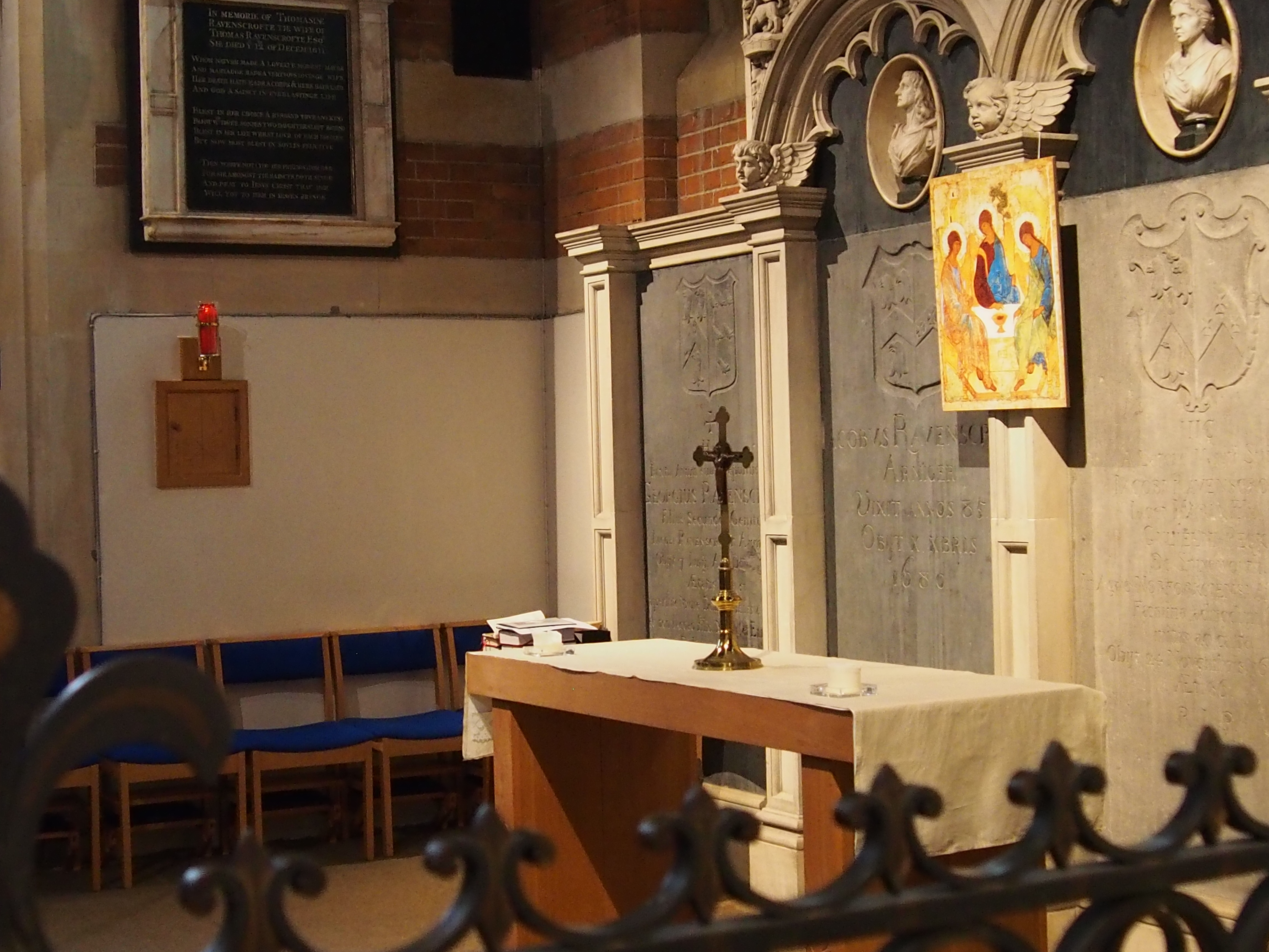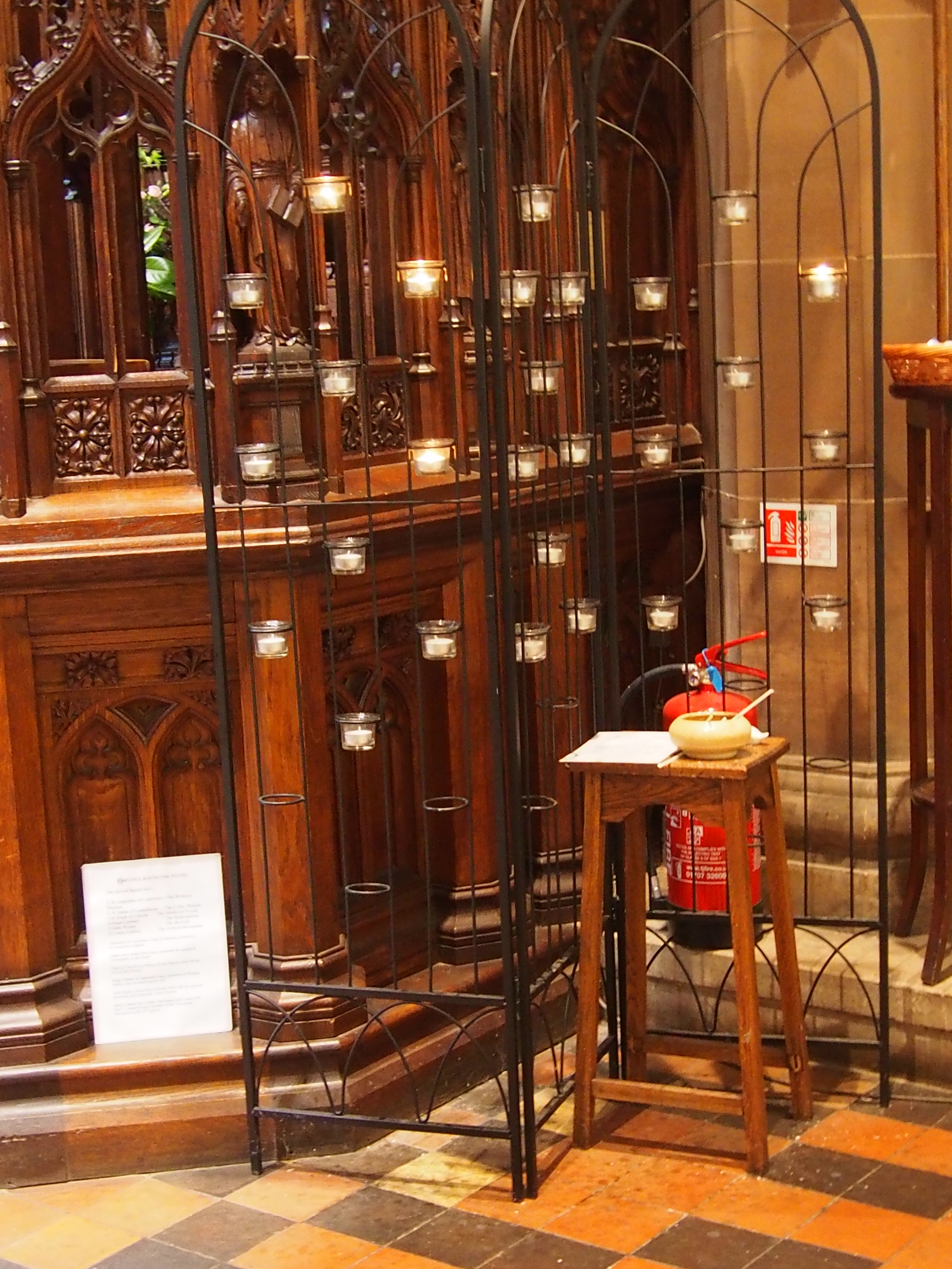 The Ravenscroft Chapel is available for quiet prayer and this is a lovely peaceful space. Some lights were on and there is a votive stand and prayer request box to use. Several icons are displayed in the church and there are also some pictures of church officers etc.
